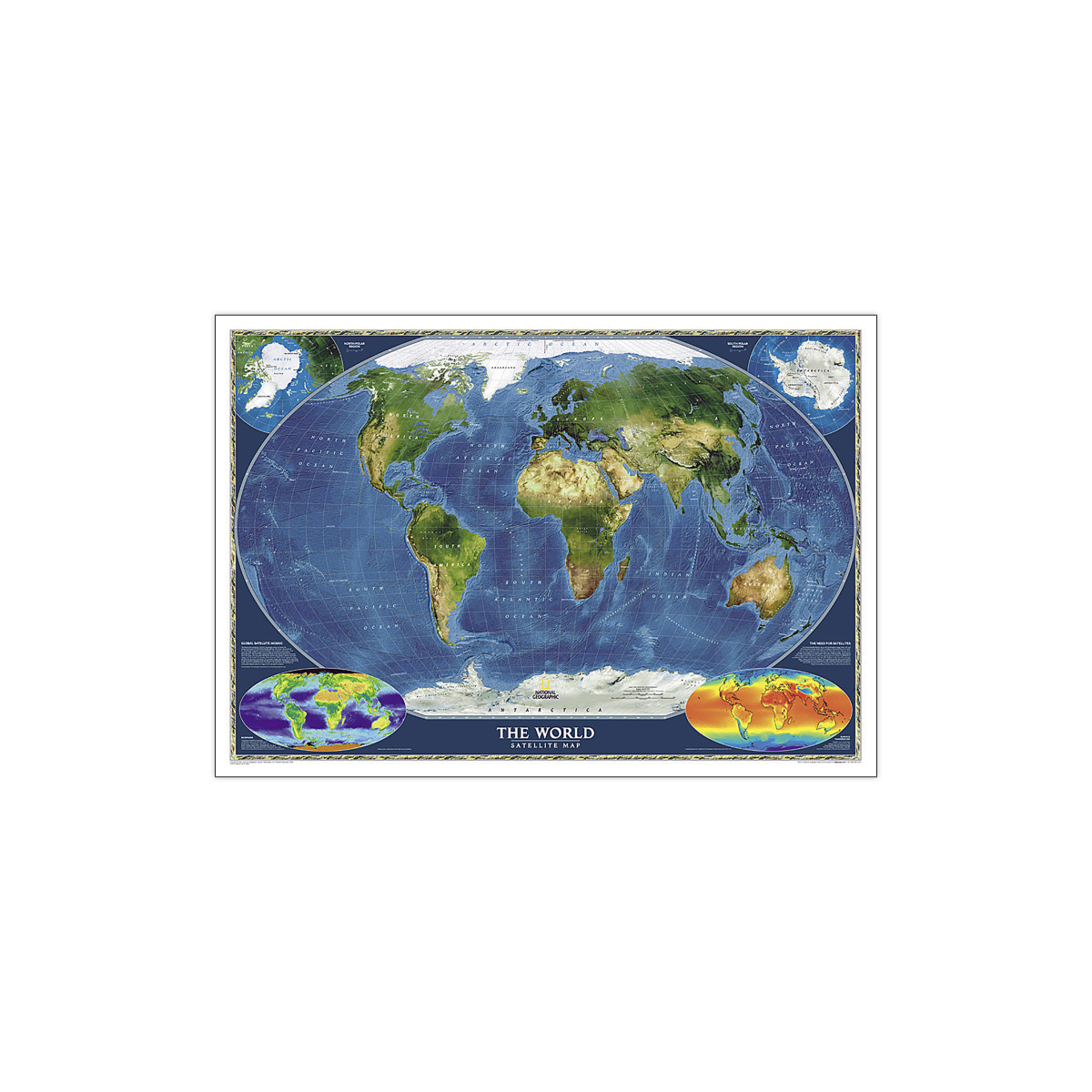 National Geographic's striking satellite map of The World is a visually stunning image that makes a wonderful addition to the wall of any office or study. This detailed composite map draws from more than 500 satellite images to give one-kilometer detail and consistent representation of Earth's natural colors and terrain. Inset maps detail the biosphere, surface temperature, and the polar regions. The beauty and complexity of Earth's landscapes, both above and below the oceans, is revealed with the Global Satellite Mosaic which was produced for National Geographic Society by NASA's Jet Propulsion Laboratory.