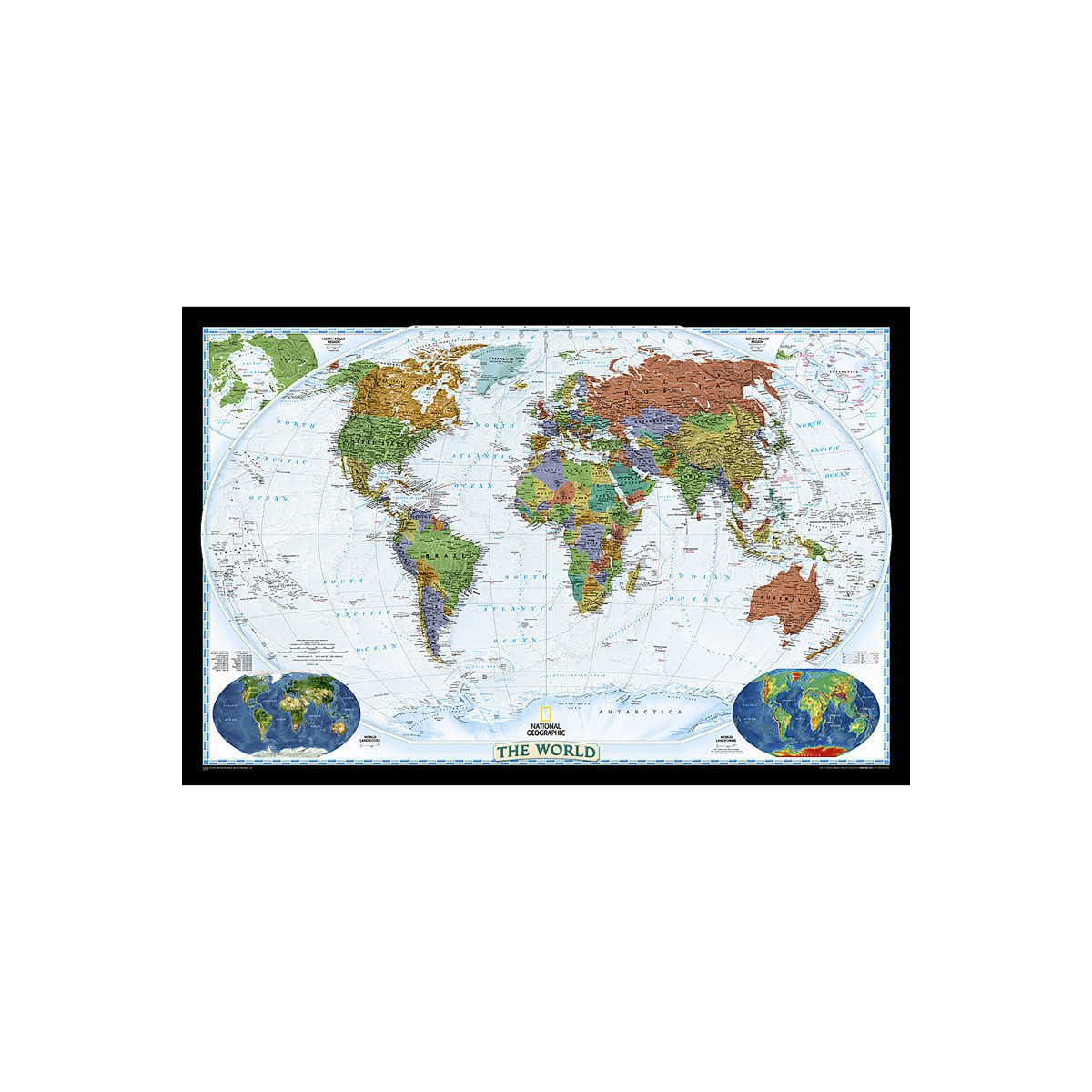 Expertly researched and designed, National Geographic's World Wall Map is the authoritative map of the world by which other reference maps are measured. Colorful Decorator style map with vibrant color palette that fills each country for easy identification.Background shows mountain ranges and valleys in subtle shaded relief with mountain ranges labeled. Major water bodies including rivers, lakes, glaciers, oceans, seas, gulfs, bays, straits, and bathymetry. Clearly defined international boundaries, cities, islands, airports, and physical features. Thousands of place names carefully and artfully placed to maintain legibility in heavily populated areas. Up-to-date international boundaries and territorial control reflect de facto status on the ground. Meticulously researched using multiple authoritative sources including the U.N., U.S. Board on Geographic Names, and policies of individual governments. Accurate place names use a combination of conventional English names, official national names, and standard transliterations for non-Latin alphabets. Drawn in Winkel Tripel projection with distortions minimized unlike other World maps (e.g. Greenland is shown the same size as Argentina, not South America). Corner inset maps feature vegetation, land use, population density, and north and south polar regions. Enlarged maps provide an immersive experience in any home or office environment. The exceptional cartography is even easier to appreciate at the larger size. The map is encapsulated in heavy-duty 1.6 mil laminate which makes the paper much more durable and resistant to the swelling and shrinking caused by changes in humidity. Laminated maps can be framed without the need for glass, so the frames can be much lighter and less expensive.