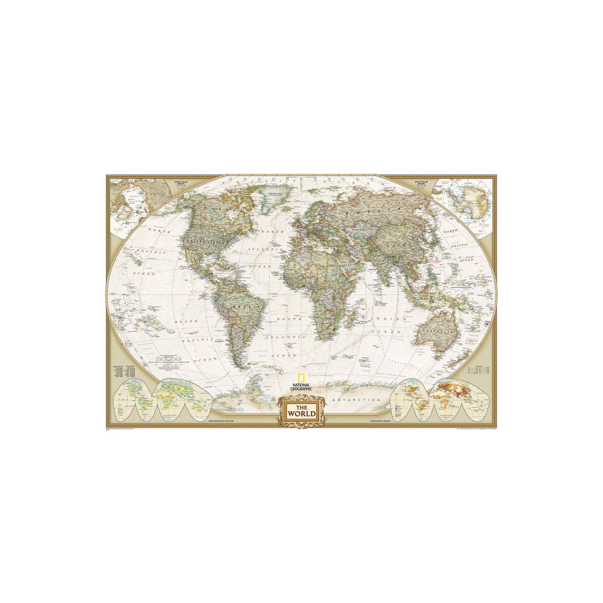 Expertly researched and designed, National Geographic's World Wall Map is the authoritative map of the world by which other reference maps are measured. Antique-style "executive" color palette. Background shows mountain ranges and valleys in subtle shaded relief with mountain ranges labeled. Major water bodies including rivers, lakes, glaciers, oceans, seas, gulfs, bays, straits, and bathymetry. Clearly defined international boundaries, cities, islands, airports, and physical features. Thousands of place names carefully and artfully placed to maintain legibility in heavily populated areas. Up-to-date international boundaries and territorial control reflect de facto status on the ground. Meticulously researched using multiple authoritative sources including the U.N., U.S. Board on Geographic Names, and policies of individual governments. Accurate place names use a combination of conventional English names, official national names, and standard transliterations for non-Latin alphabets. Drawn in Winkel Tripel projection with distortions minimized unlike other World maps (e.g. Greenland is shown the same size as Argentina, not South America). Corner inset maps feature vegetation, land use, population density, and north and south polar regions. Enlarged maps provide an immersive experience in any home or office environment. The exceptional cartography is even easier to appreciate at the larger size. The map is encapsulated in heavy-duty 1.6 mil laminate which makes the paper much more durable and resistant to the swelling and shrinking caused by changes in humidity. Laminated maps can be framed without the need for glass, so the frames can be much lighter and less expensive.