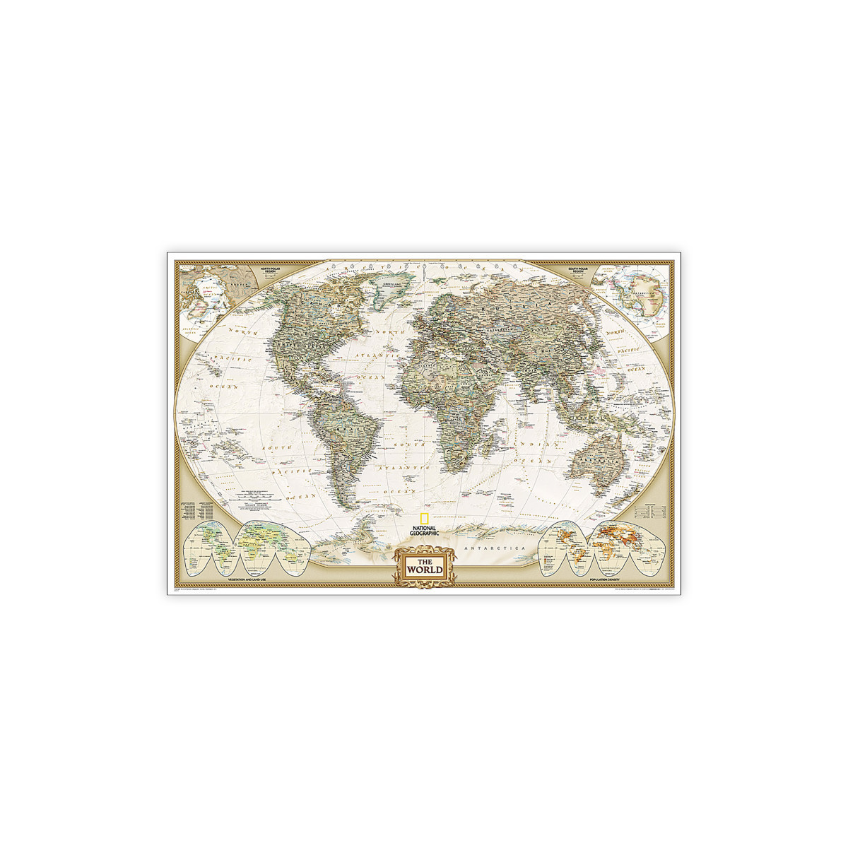 Expertly researched and designed, National Geographic's World Wall Map is the authoritative map of the world by which other reference maps are measured. Antique-style "executive" color palette. Background shows mountain ranges and valleys in subtle shaded relief with mountain ranges labeled. Major water bodies including rivers, lakes, glaciers, oceans, seas, gulfs, bays, straits, and bathymetry. Clearly defined international boundaries, cities, islands, airports, and physical features. Thousands of place names carefully and artfully placed to maintain legibility in heavily populated areas. Up-to-date international boundaries and territorial control reflect de facto status on the ground. Meticulously researched using multiple authoritative sources including the U.N., U.S. Board on Geographic Names, and policies of individual governments. Accurate place names use a combination of conventional English names, official national names, and standard transliterations for non-Latin alphabets. Drawn in Winkel Tripel projection with distortions minimized unlike other World maps (e.g. Greenland is shown the same size as Argentina, not South America). Corner inset maps feature vegetation, land use, population density, and north and south polar regions. The 36" x 24" poster size supports easy and affordable framing and mounting, and takes less wall space than standard wall maps. The map is encapsulated in heavy-duty 1.6 mil laminate which makes the paper much more durable and resistant to the swelling and shrinking caused by changes in humidity. Laminated maps can be framed without the need for glass, so the frames can be much lighter and less expensive.
