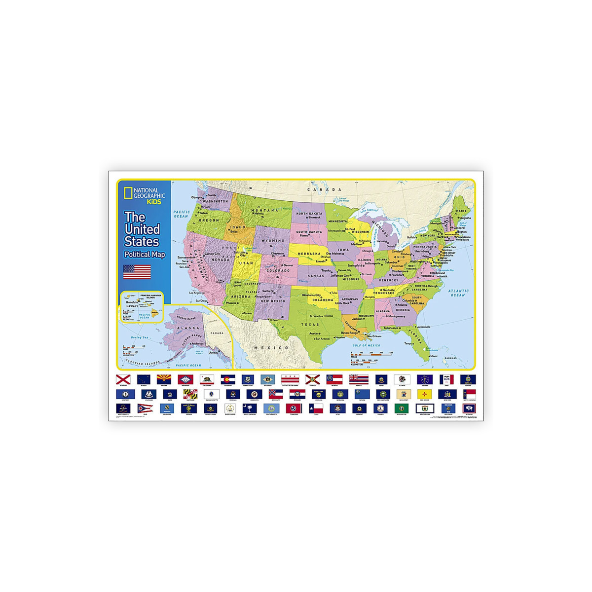 Expertly researched and designed, National Geographic's The United States for Kids wall map is an enticing and engaging United States map perfect for classroom, home or library. Recommended by geography educators for ages 7 – 12, this map features an optimized map design for readability and easy, intuitive learning. All 50 states and the District of Columbia are shown with their official, colorful flags, The flags are arranged in alphabetical order for ease-of-use. Expertly researched, The United States for Kids map is an essential reference tool for today's well informed student of geography.