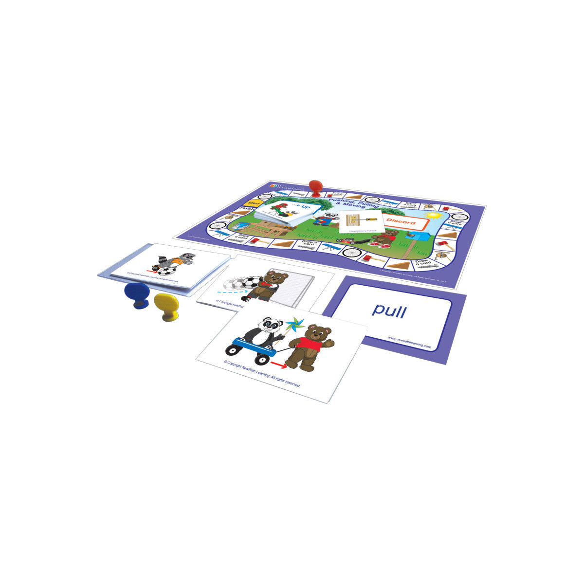 The game and the accompanying matching flash cards help students develop skills in basic physical science concepts, including moving and pulling objects, as well as the concepts of push, up, down, sink, float and others. Packaged in a durable pouch, the game can be used in the classroom, after school programs or home practice and are perfect for differentiated instruction. Designed for either teacher-directed or independent play in groups of 2-4 students, each game includes a Laminated, Hands-On Board game with 30 illustrated, self-checking cards and game materials for up to 4 students; two sets of 30 Flash Cards printed on heavy 4" x 5.
