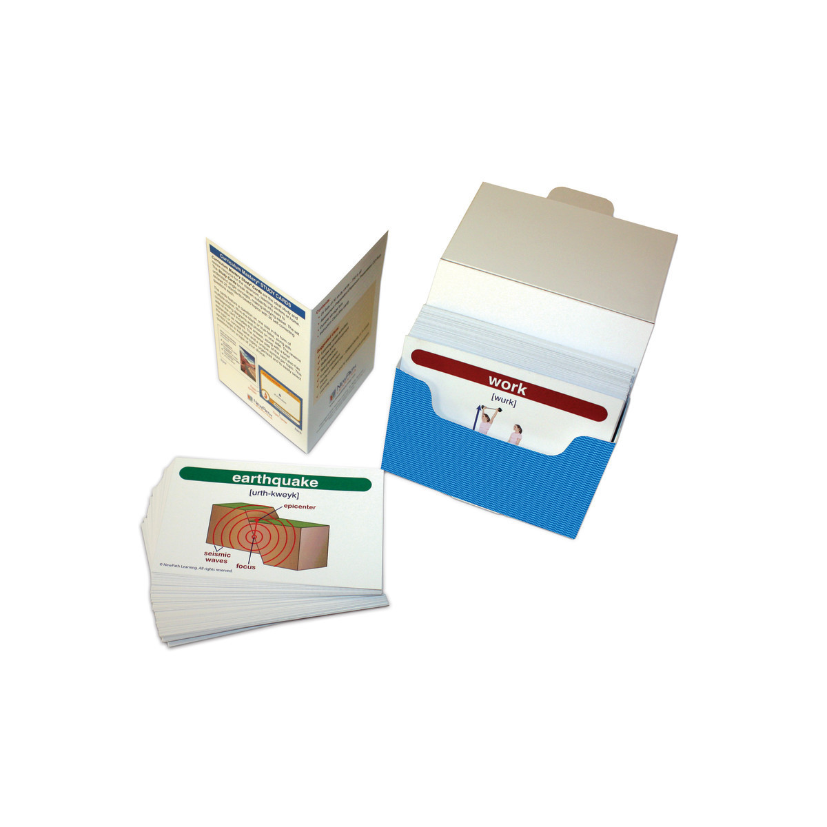 NewPath's Science Vocabulary Builder flash card sets provide comprehensive coverage of the key terms in the Disciplinary Core Ideas of the Next Science Generation Standards and current state standards. Colorfully illustrated, the cards can be used to conduct a variety of engaging activities and games which foster lasting understanding of key concepts. Includes 200 Flash Cards- colorfully illustrated and printed on 4" x 5-1/2" heavy stock — teacher resource guide with suggested activities and a trial subscription to NewPath's Online Learning Program. Each card features the term, its pronunciation and a graphic depiction on one side and the term's definition on the reverse.