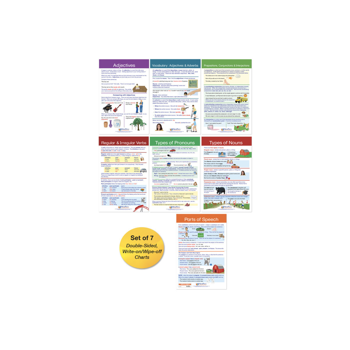 Each Bulletin Board Chart Set includes a collection of separate posters, each covering a separate, curriculum topic. Uniquely designed, while one side can be posted for student reference, the reverse features dry-erase activities perfect for individual student review or as a learning center activities! Graphic images and hands-on activities combine to provide comprehensive coverage of essential student skills and cover the current state and national standards! Each 12" x 18" Chart is laminated and double-sided – Side 1 features a graphic overview of the topic and Side 2 provides "write-on/wipe-off" activities. Covers Adjectives; Parts of Speech; Vocabulary – Adjectives & Adverbs; Types of Nouns; Types of Pronouns; Prepositions, Conjunctions & Interjections; and Regular & Irregular Verbs.