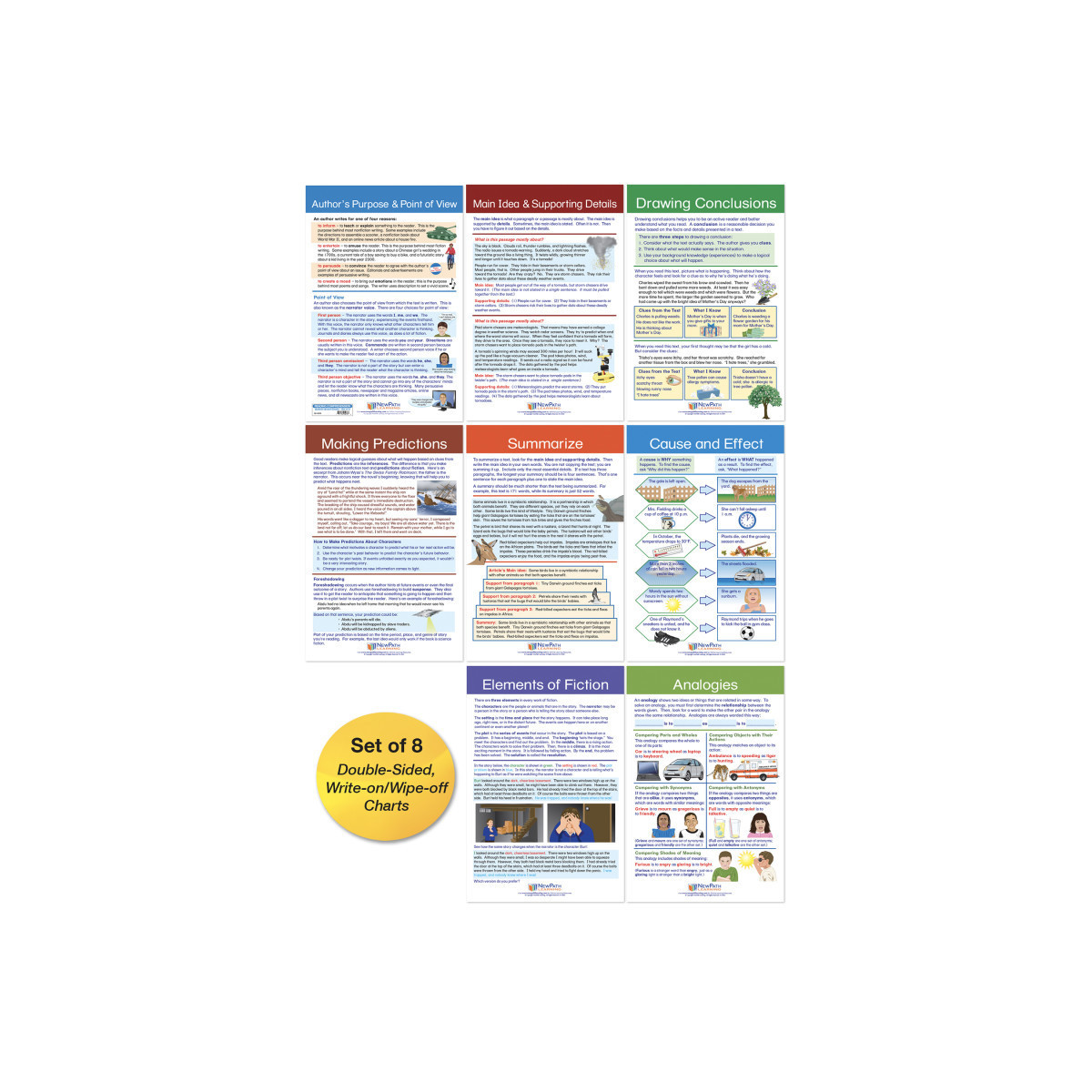 Each Bulletin Board Chart Set includes a collection of separate posters, each covering a separate, curriculum topic. Uniquely designed, while one side can be posted for student reference, the reverse features dry-erase activities perfect for individual student review or as a learning center activities! Graphic images and hands-on activities combine to provide comprehensive coverage of essential student skills and cover the current state and national standards! Each 12" x 18" Chart is laminated and double-sided – Side 1 features a graphic overview of the topic and Side 2 provides "write-on/wipe-off" activities. Covers Author's Purpose & Point-of-View; Main Idea & Supporting Details; Making Predictions; Drawing Conclusions; Summarize; Cause & Effect; Analogies; and Elements of Fiction.