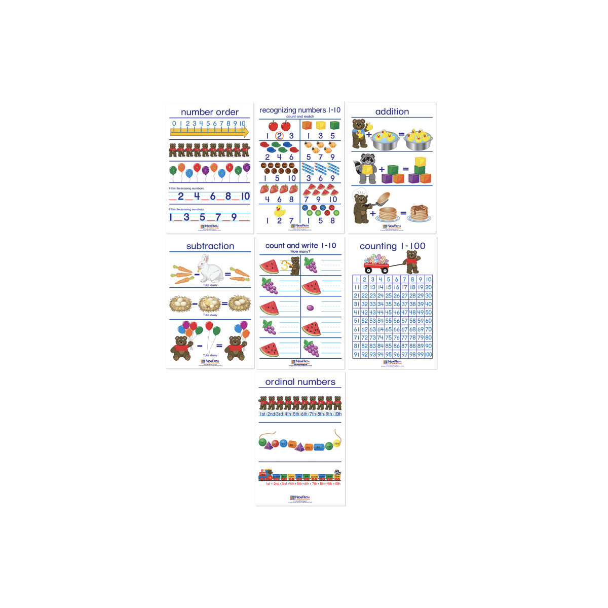 Graphically stimulating, well-organized and highly educational, the Number Sense Bulletin Board Chart Set provides an excellent reference resource for your classroom bulletin board or wall, or as a hands-on activity for instruction, review and reinforcement for students in your Early Childhood Math curriculum. The Number Sense Bulletin Board Chart Set includes a collection of 7 individual 12" x 18" laminated charts, each covering a separate, curriculum topic. Uniquely designed, Side 1 features a graphic overview of the topic while Side 2 provides "write-on/wipe-off" activity exercises for review and reinforcement. Graphic images and hands-on activities combine to provide comprehensive coverage of essential student information. Perfect for classroom or for use in learning centers/small group activities; independent study and remediation; or as a teacher resource for introduction and review of key concepts. Topics covered: Number Order; Recognizing Numbers; Addition; Count & Write Numbers 1 - 10; Ordinal Numbers; Counting 1 - 100; and Subtraction.