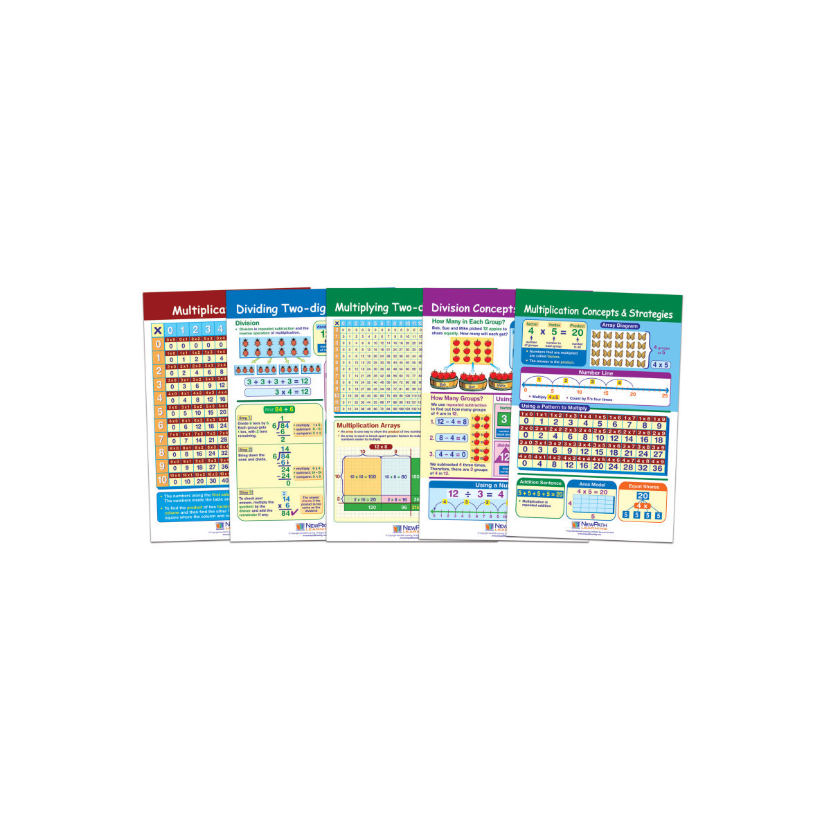 Features a collection of separate posters, each covering a separate, curriculum topic. Uniquely designed, while one side can be posted for student reference, the reverse features dry-erase activities perfect for individual student review or as a learning center activities! Graphic images and hands-on activities combine to provide comprehensive coverage of essential student skills and cover the current state and national standards — including Common Core! Each 12" x 18" Chart is laminated and double-sided — Side 1 features a graphic overview of the topic and Side 2 provides "write-on/wipe-off" activities. Covers Multiplication Concepts & Strategies; Multiplication Table; Division Concepts & Strategies; Multiplying Two-Digit Numbers; and Dividing Two-Digit Numbers.