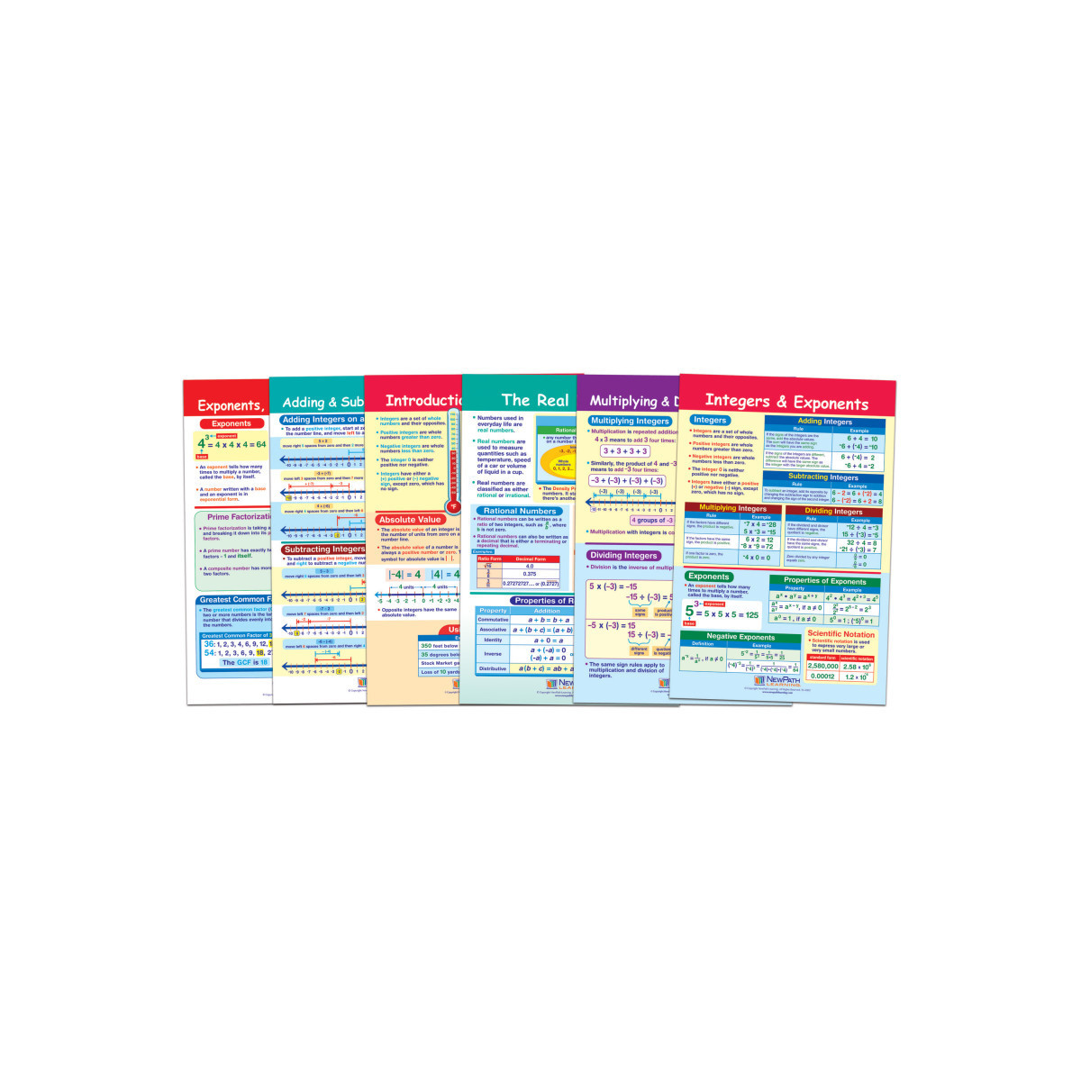 Features a collection of separate posters, each covering a separate, curriculum topic. Uniquely designed, while one side can be posted for student reference, the reverse features dry-erase activities perfect for individual student review or as a learning center activities! Graphic images and hands-on activities combine to provide comprehensive coverage of essential student skills and cover the current state and national standards — including Common Core! Each 12" x 18" Chart is laminated and double-sided — Side 1 features a graphic overview of the topic and Side 2 provides "write-on/wipe-off" activities. Covers Introduction to Integers; Adding & Subtracting Integers; Multiplying & Dividing Integers; Integers & Exponents; The Real Numbers; and Exponents, Factors & Multiples