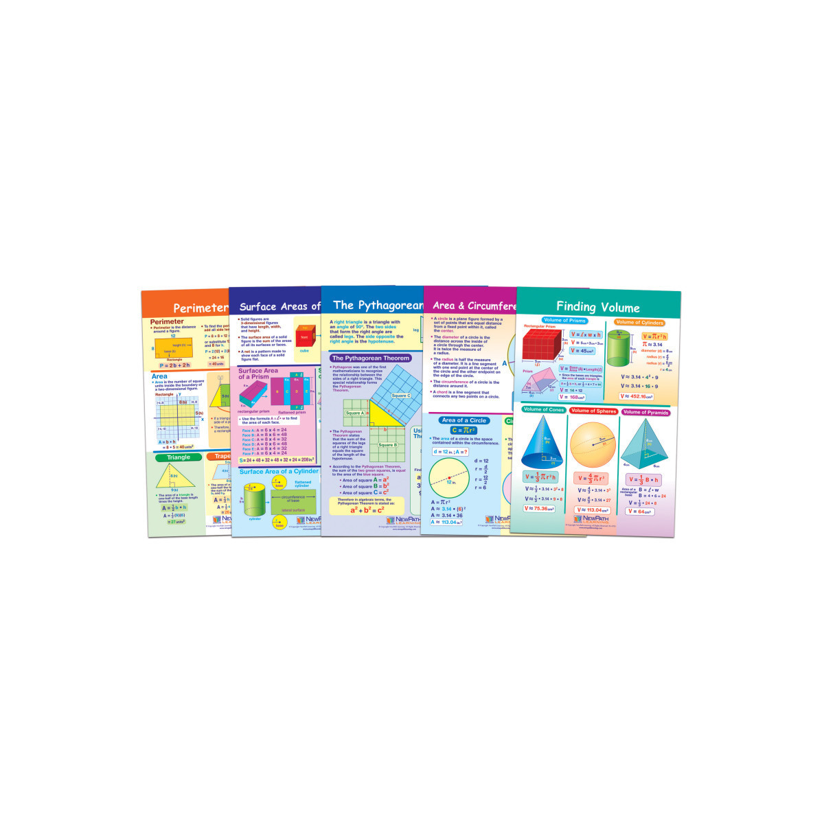 Features a collection of separate posters, each covering a separate, curriculum topic. Uniquely designed, while one side can be posted for student reference, the reverse features dry-erase activities perfect for individual student review or as a learning center activities! Graphic images and hands-on activities combine to provide comprehensive coverage of essential student skills and cover the current state and national standards — including Common Core! Each 12" x 18" Chart is laminated and double-sided — Side 1 features a graphic overview of the topic and Side 2 provides "write-on/wipe-off" activities. Covers Perimeter & Area; Finding Volume; Surface Area of Solid Figures; Area & Circumference of Circles; and The Pythagorean Theorem.