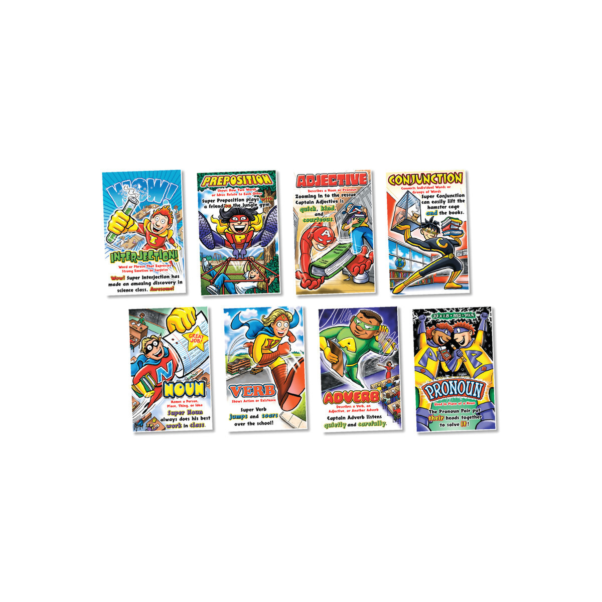 These superheroes make learning parts of speech dramatic and exciting! Each colorful 11" x 17" (27.9 x 43.2 cm) poster features a clear definition and an example. Includes a four-page teacher guide with reproducibles. 8 pieces.