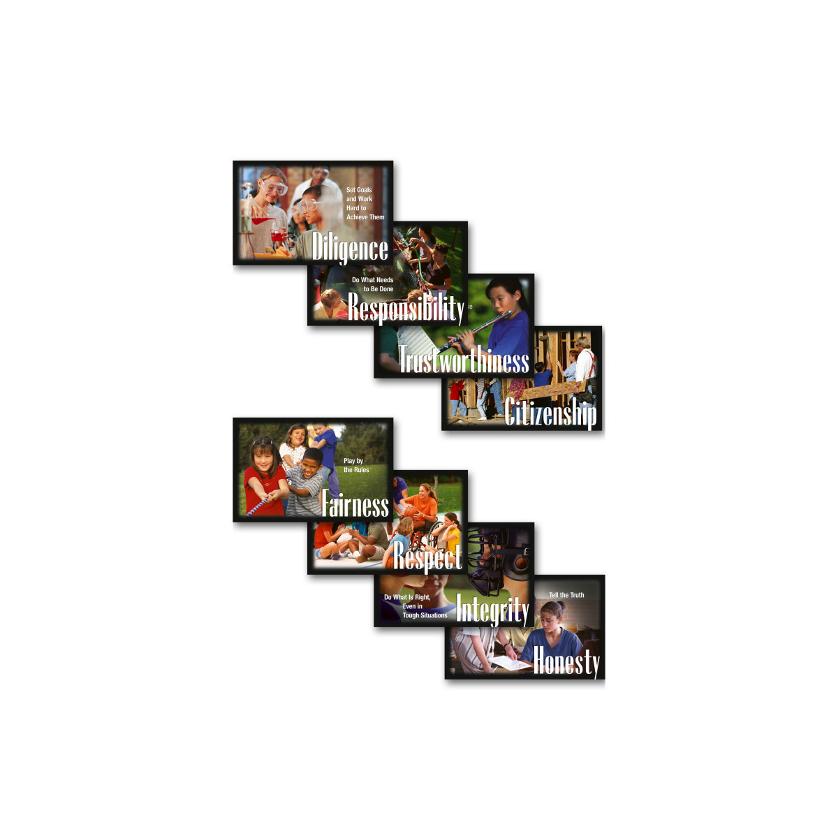 Engaging photos highlight building blocks for developing strong character and a caring classroom community. Features citizenship, diligence, fairness, honesty, integrity, respect, responsibility, and trustworthiness. Eight colorful 11'' x 17'' (27.9 x 43.2 cm) posters per package. Includes a two-page teacher guide.
