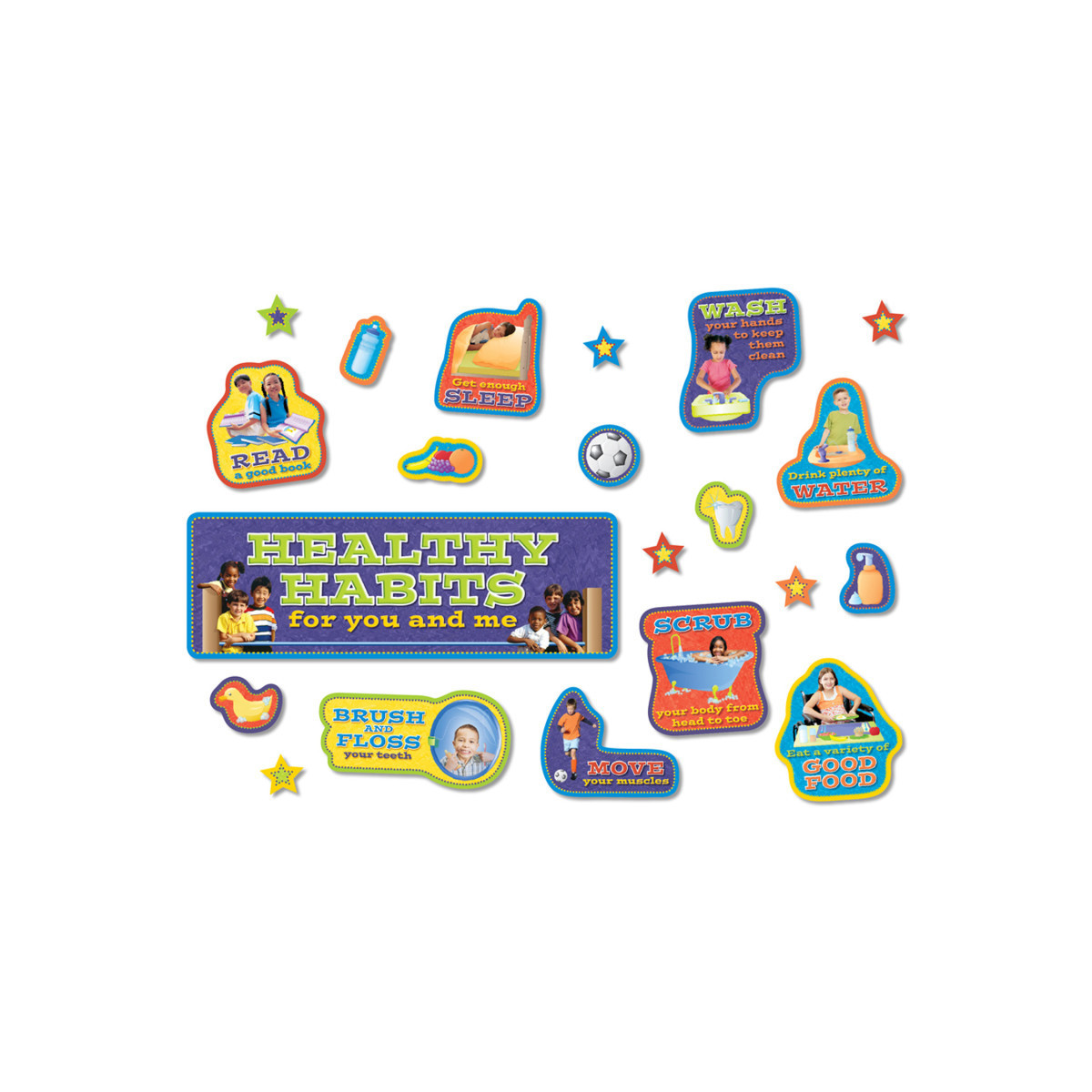 Motivate students to establish a healthy lifestyle! Engaging photos and fun illustrations highlight important messages about taking care of your body and mind. Features a 30.5" x 10.5" (77.5 X 26.7 cm) "Healthy Habits" banner. Includes a four page teacher guide with reproducibles. Includes 38 pieces. Not all pieces shown.