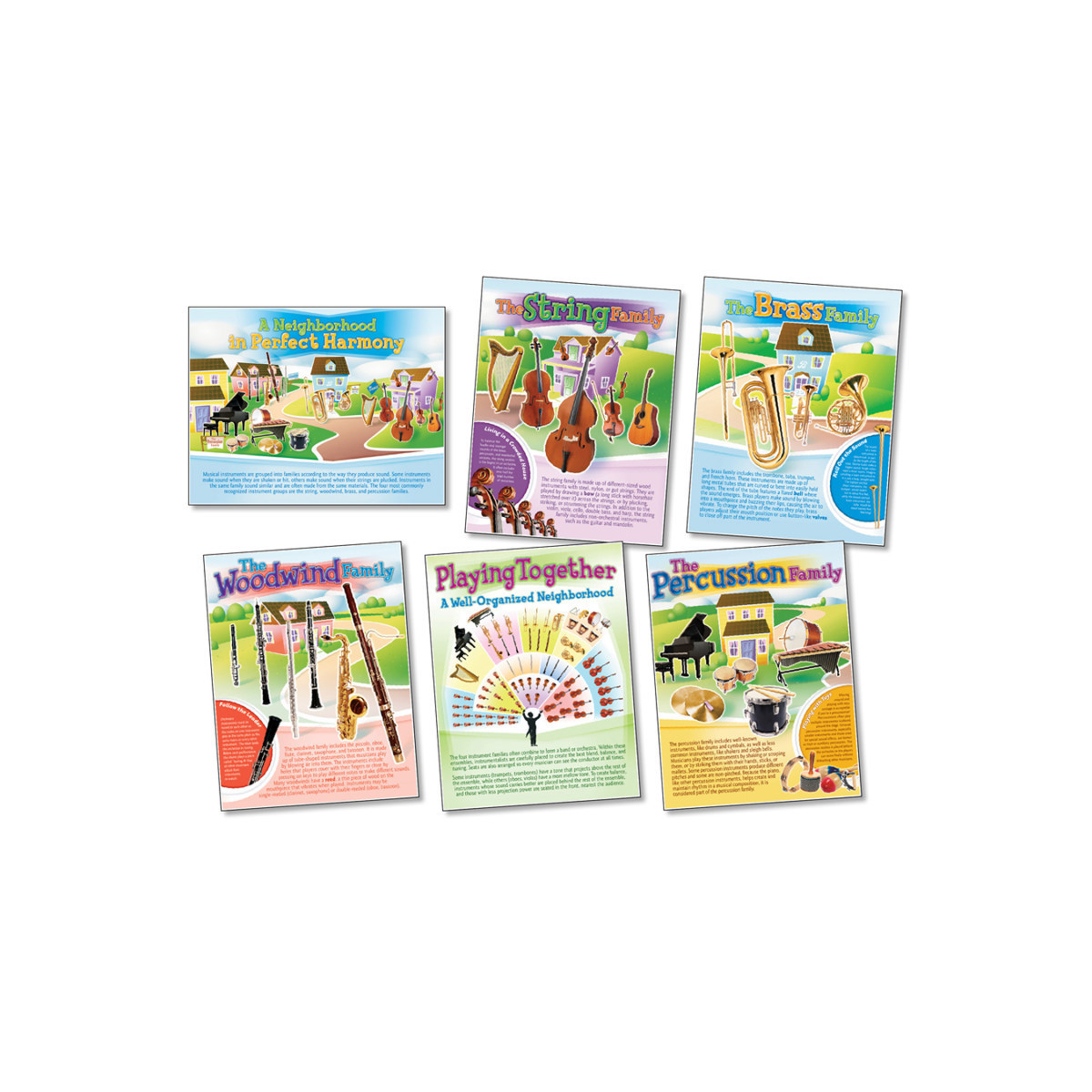 Invite students to explore a unique neighborhood inhabited entirely by musical instrument families. Imaginative illustrations of individual households provide an engaging backdrop for photographs of the four primary instrument groups. A coordinating poster focuses on combining the instrument families into an orchestra or band. Features six 17'' x 22'' (43.2 x 55.9 cm) posters and a four-page teacher guide with reproducibles.