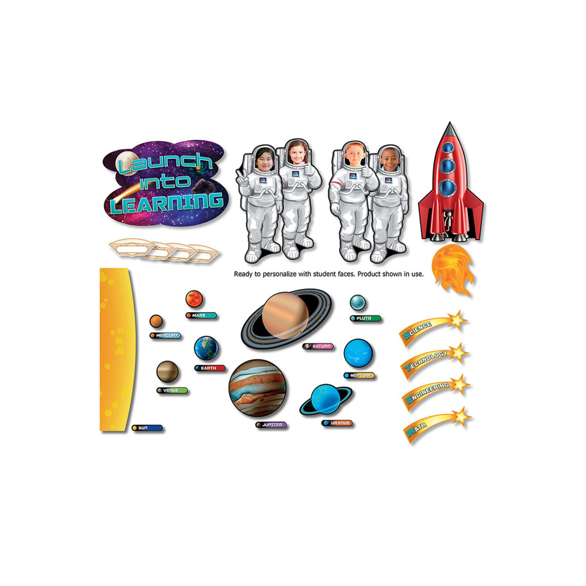Explore new galaxies with this versatile, welcome-to-the-classroom set featuring planets, astronauts, and other space-themed artwork. Die-cut astronauts (16" high) are designed for personalization with students' photos, and commander badges to assign rotating classroom tasks are sure to capture students' imagination. Other pieces include planets with labels to teach about the solar system, and comets featuring the S.T.E.M. acronym—a natural extension of astronomy and space exploration. 35 pieces.