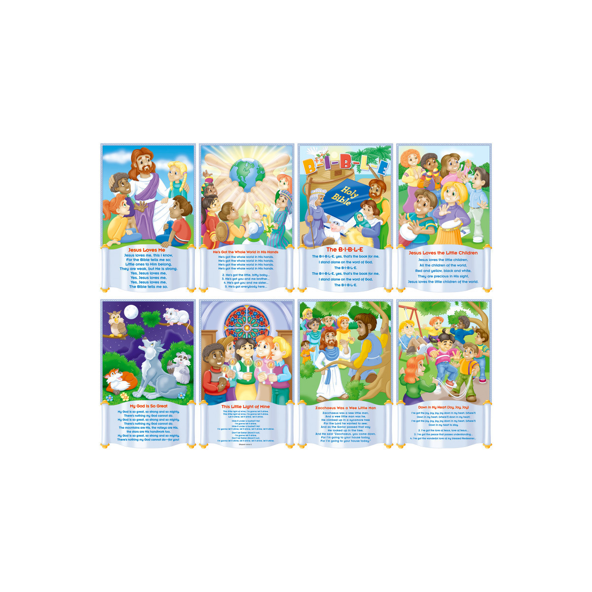 North Star Teacher Resources® Bulletin board set with children's Bible songs theme features popular Sunday school songs and is ideal for toddler through grade 3. Each 11'' x 17'' (27.9 x 43.2 cm) poster features a popular Sunday school song: The B-I-B-L-E, Down in My Heart (Joy, Joy, Joy), He's Got the Whole World in His Hands, Jesus Loves Me, Jesus Loves the Little Children, My God Is So Great, This Little Light of Mine, and Zacchaeus Was a Wee Little Man. Includes a four-page teacher guide with reproducibles. Includes 8 pieces.