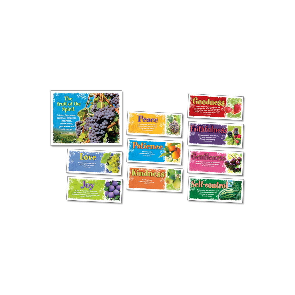 A 22" x 17" (55.9 x 43.2 cm) theme poster features the well-known verses in Galatians about the fruit of the Spirit, and nine 17" x 7.3" (43.2 x 18.6 cm) posters individually highlight each spiritual fruit, with an accompanying quotation