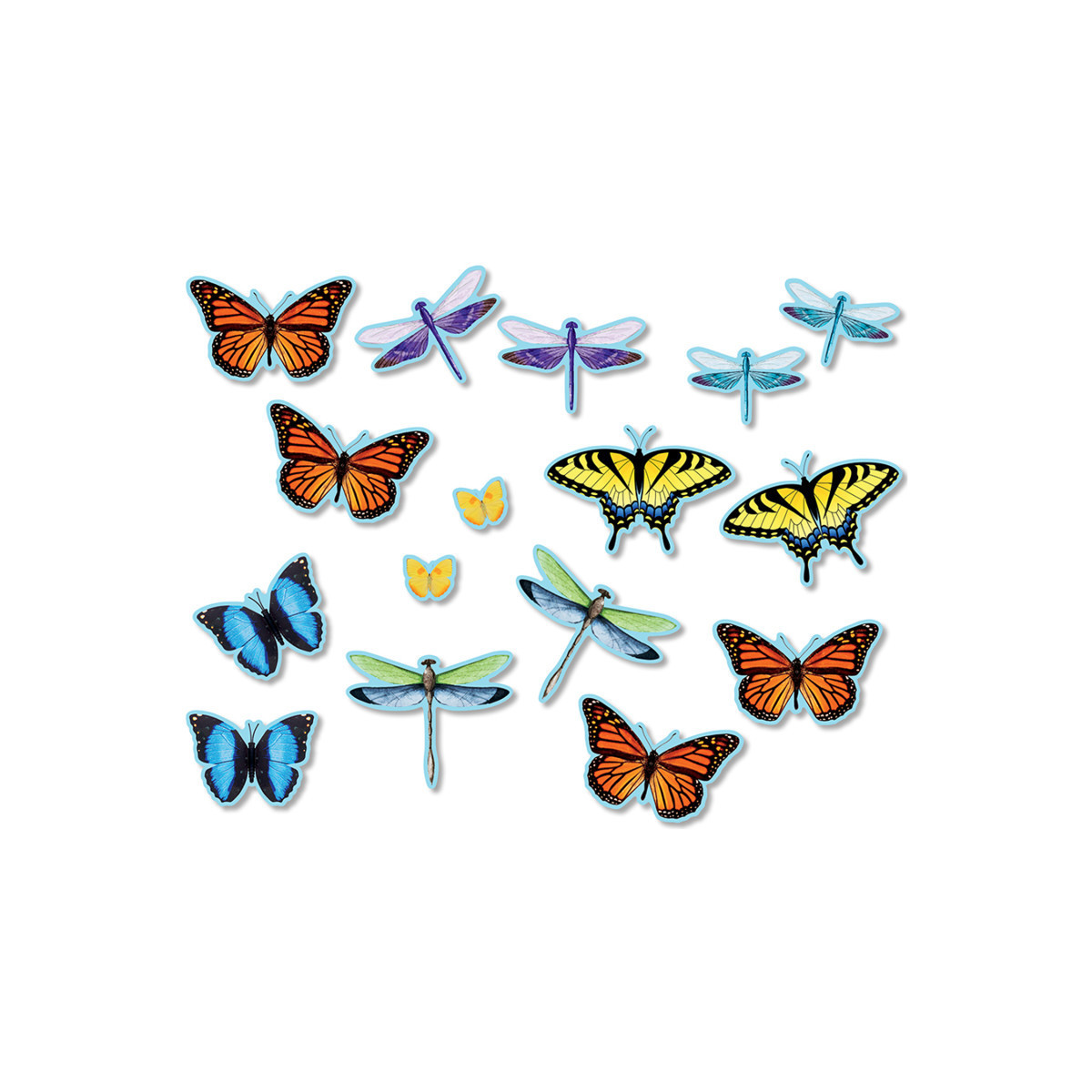 Use accents to liven up bulletin boards, desks, lockers, and cubbies! Can be used as name tags, labels, or to highlight student work. Accents are an excellent resource to use in kid-crafting or art projects. Add your own ribbon or string to craft a festive bunting, or hanging mobile. Use for student rewards or as swag tags. Size of individual accents vary. Set features 4 different butterflies and 3 unique dragonflies. Monarch measures 5-1/4'' wide with other pieces shown to scale. Each pack includes 64 precut pieces.