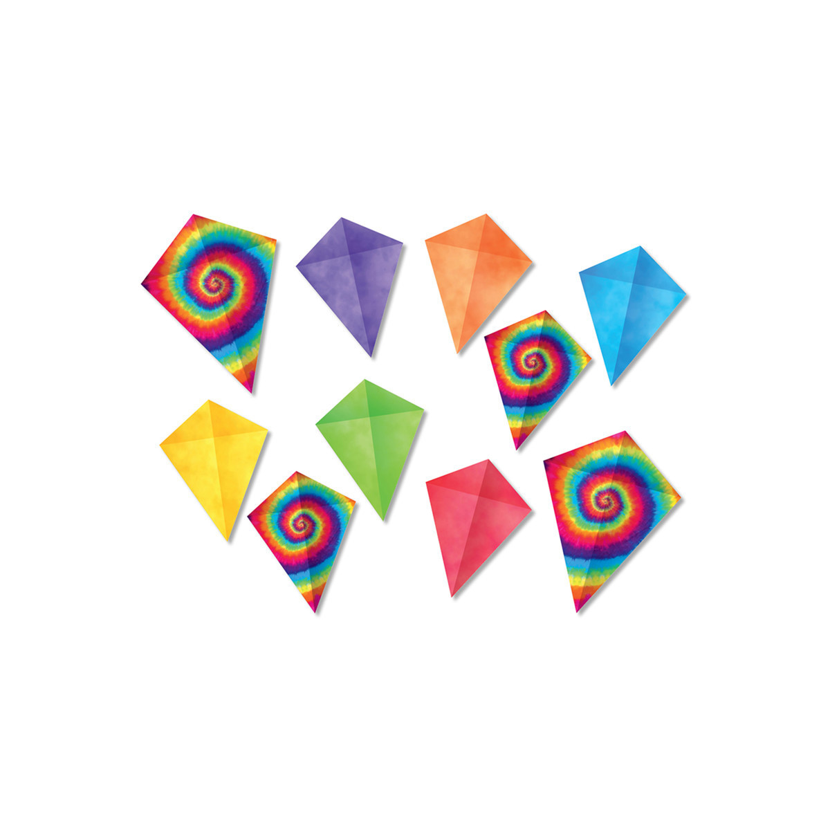 Use accents to liven up bulletin boards, desks, lockers, and cubbies! Can be used as name tags, labels, or to highlight student work. Add your own ribbon or string to craft a festive bunting, or hanging mobile. Accents are an excellent resource for use in kid-crafting or art projects. Two kite sizes are included, large tie-dyes measure 8-1/8'' H x 6 1/8'' W; small kites measure 6-1/4'' H x 4-3/4'' W, in tie-dye swirl pattern and six solid-colors. We've included bonus uncut kite bows. Just cut out bows to add with your ribbon or string to create kite tails for a hands-on activity. Each pack includes 40 precut kites.