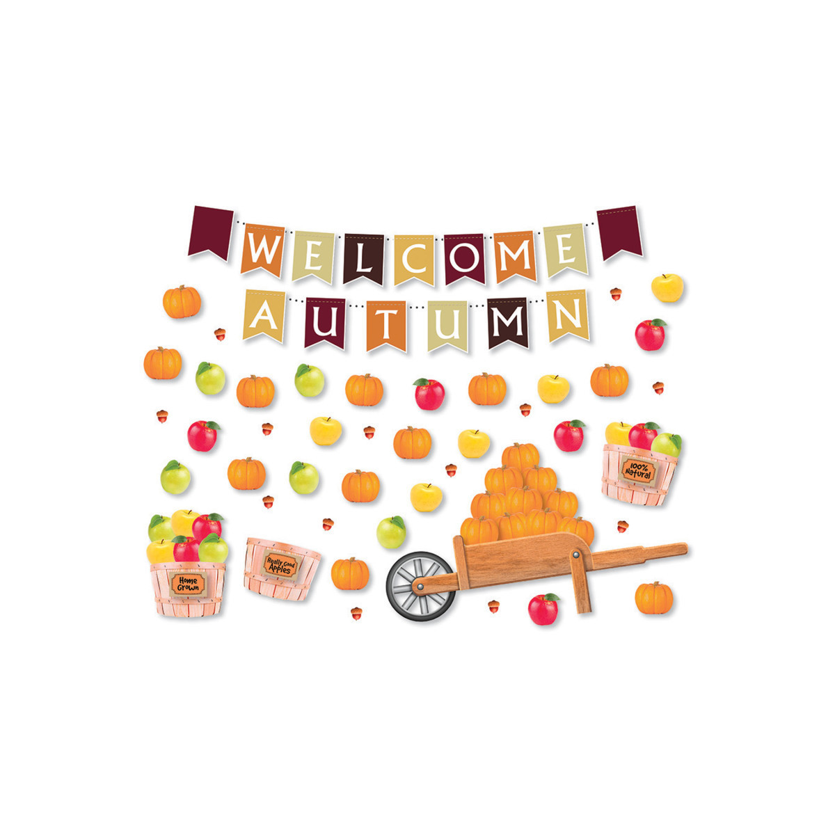 Use our harvest themed bulletin board to illustrate counting, sorting, grouping, and to illustrate simple math story problems. Photo-realistic set features a natural wooden cart (31.25" x 8.75"), 36 pumpkins (4" wide), 45 apples (3.25" wide) in three colors, 3 baskets (7.75" wide), 4 signs (4" wide), 16 flags to create a festive fall flag banner, and 13 acorns (acorns are not precut). 105 pre-cut pieces.