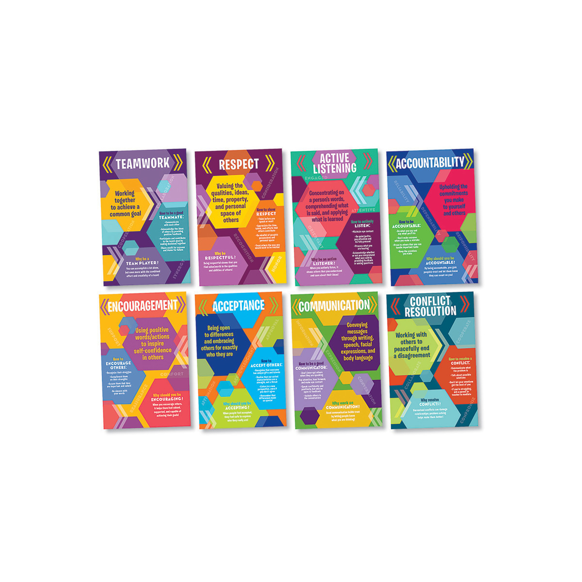 Social Skills: Shaping Successful Relationships Bulletin Board Set provides students the tools for achieving strong relationships with family, friends, teachers, and peers! Set includes eight 11" x 17" (27.9 x 43.2 cm) posters, each focused on the intent, purpose, and manner in which to accomplish a specific social skill. 8 pieces total.