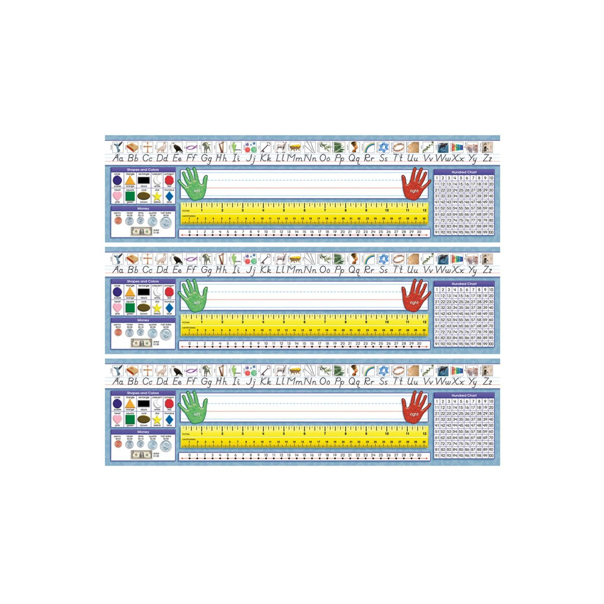 Improve learning levels with handy desk references. Simply write in student names and tape to student desks for year-round use. Primary desk plates include photo alphabet line, name plate with left and right handprints, 12'' (30 cm) ruler, number line (0 to 30), shapes and colors, money, and hundred chart. Measures 19 x 5" (48.3 X 12.7 cm). Includes 36 per package. Sold as 3 packs, 108 desk plates total.
