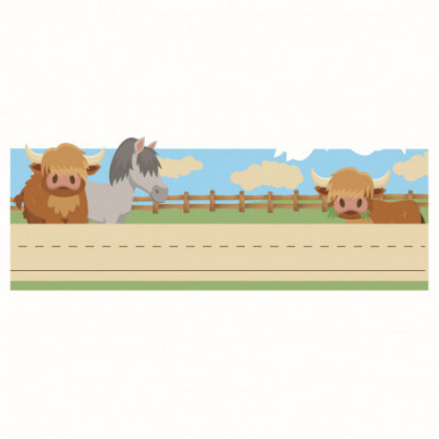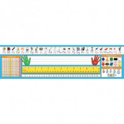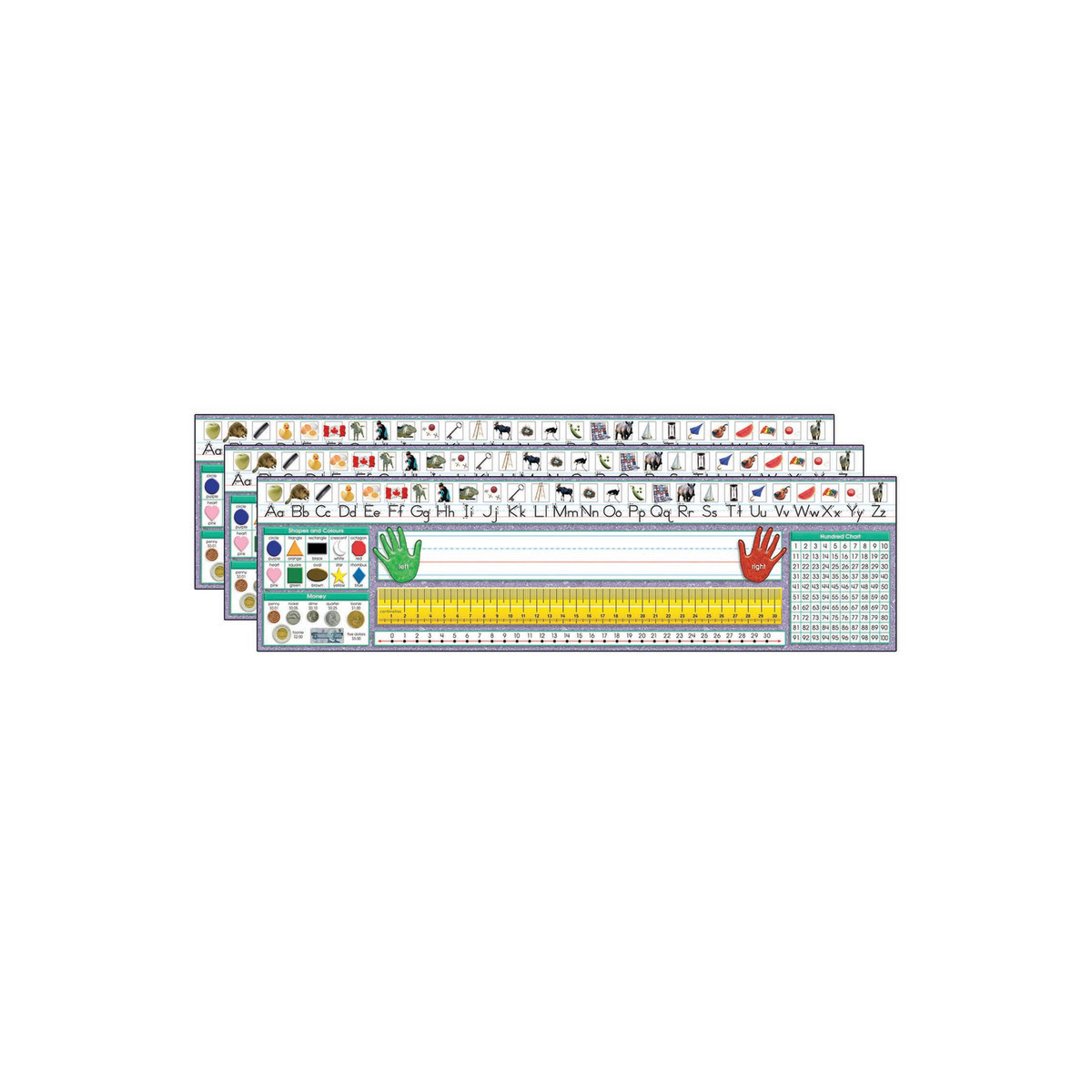 Canadian Primary desk plates include photo alphabet line, name plate with right and left handprints, 30 cm ruler, number line (0 to 30), shapes and colors, Canadian currency, and hundred chart. Measures 19" x 5" (48.3 X 12.7 cm). Includes 36 per package. Sold as 3 packs for a total of 108 desk plates.
