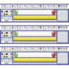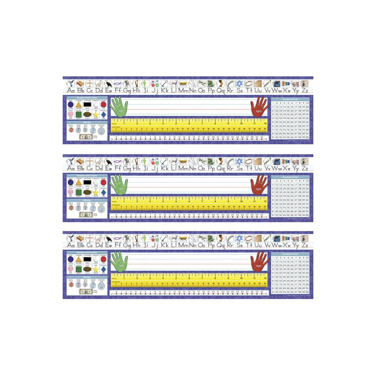 Christian Primary Traditional Manuscript Desk Plates include photo alphabet line featuring Biblical images and symbols, name plate with left and right handprints, 12" (30 cm) ruler, number line (0 to 30), shapes and colors, U.S. currency, and hundred chart. Each pack includes 36 desk plates. Sold as 3 packs for a total of 108 desk plates.