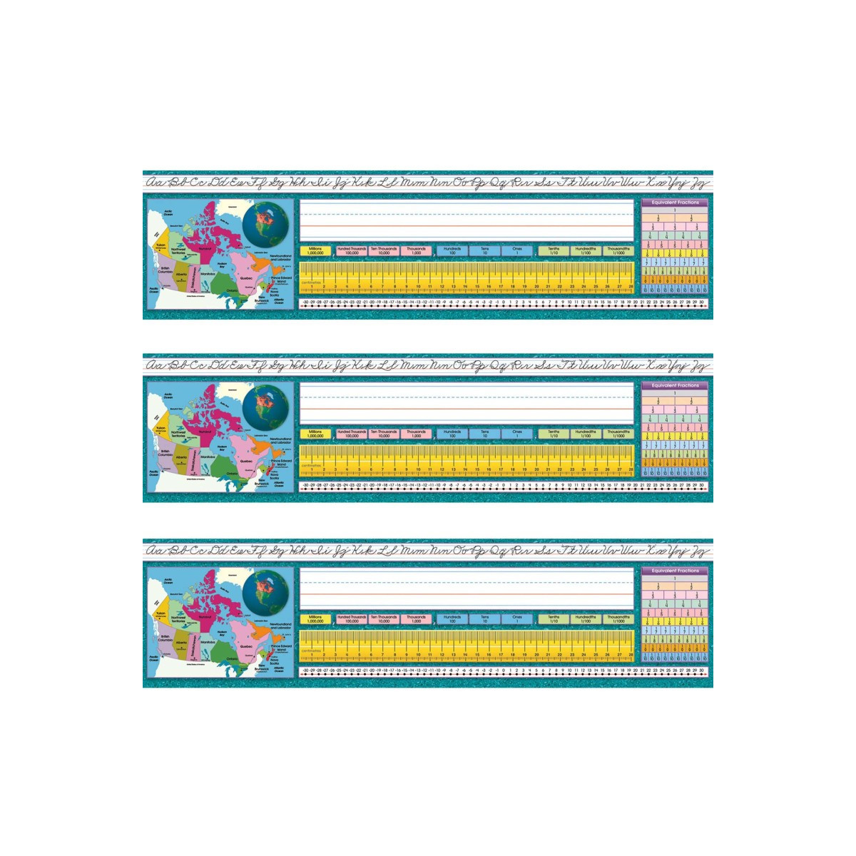 Canadian Intermediate desk plates include alphabet line, name plate, place value, 28 cm ruler, number line (-30 to 30), equivalent fractions, and a map of Canada. Measures 19" x 5". Each pack includes 36 desk plates. Sold as 3 packs for a total of 108 desk plates.