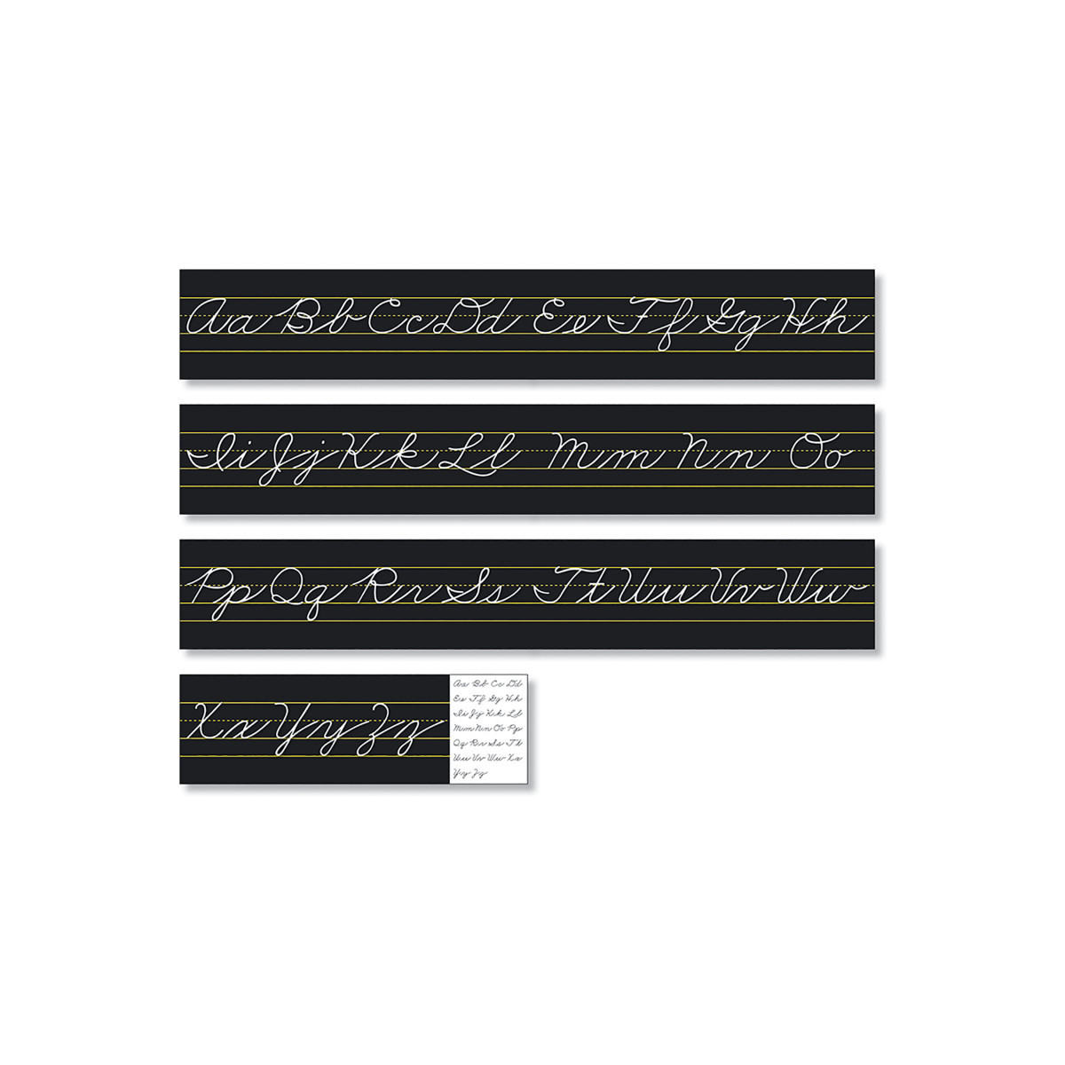 This product features Traditional Cursive typeface on a rich black background with yellow ruled lines demonstrating proper letter formation. Professionally printed educational alphabet strips, crafted with high quality materials for durability and visual clarity. Make learning more enjoyable with vivid colors, eye-catching images and educational content tailored to many grade levels. Includes 7 strips measuring 24.25" x 7.625".