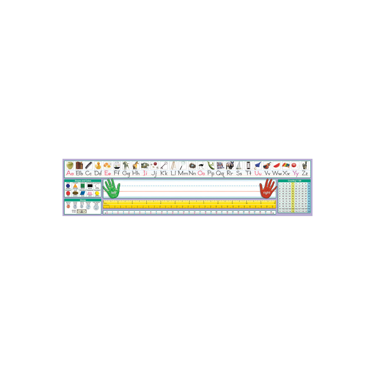 This Primary desk plate includes Traditional Manuscript photo alphabet line, name plate with left and right handprints, 12" (30 cm) ruler, number line (0 to 30), shapes and colors, U.S. currency and counting 1-120 chart. Each pack includes 36 desk plates.