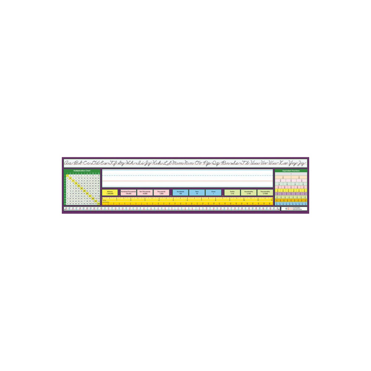 Reinforce learning and label students' desk with these easy-access desk references. Write students' name in the designated area, peel off backing, adhere desk plates to a smooth surface. Adhesive desk plates are recyclable. This Intermediate desk plate includes Traditional Cursive alphabet line, name plate, place value, 12" (30 cm) ruler, number line (-30 to 30), 12x12 multiplication chart, temperature chart, and equivalent fractions. Measures 17-1/2" x 4" (44.5 X 10.2 cm). Each pack includes 36 desk plates.