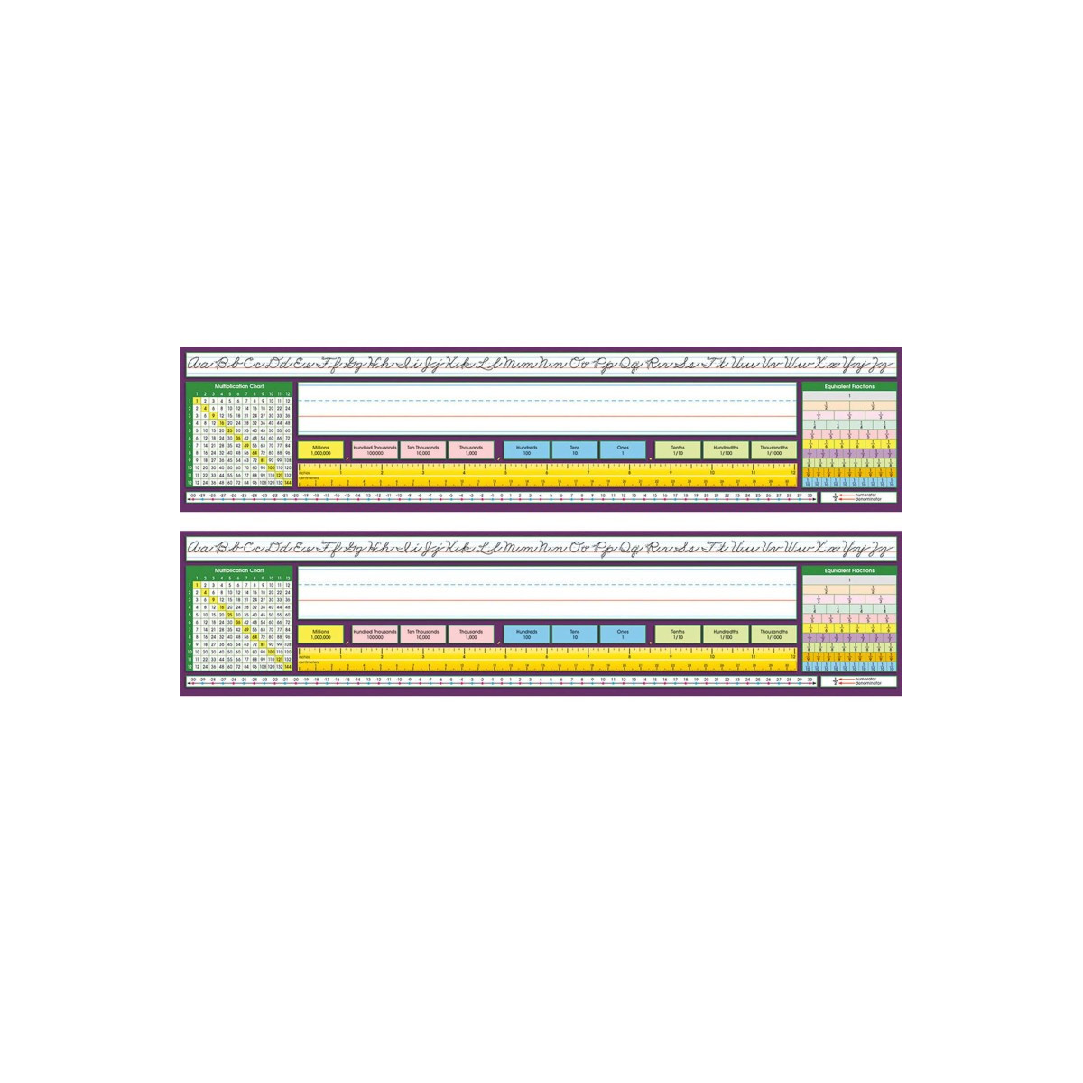 Reinforce learning and label students' desk with these easy-access desk references. Write students' name in the designated area, peel off backing, adhere desk plates to a smooth surface. Adhesive desk plates are recyclable. This Intermediate desk plate includes Traditional Cursive alphabet line, name plate, place value, 12" (30 cm) ruler, number line (-30 to 30), 12x12 multiplication chart, temperature chart, and equivalent fractions. Measures 17.5" x 4" (44.5 X 10.2 cm). Includes 36 per package. Sold as 2 packs, 72 desk plates total.
