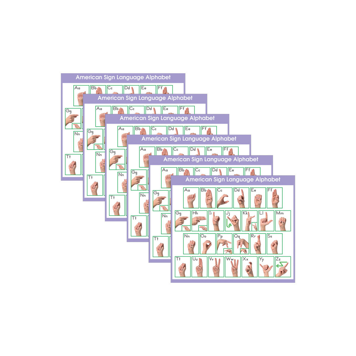 ASL Alphabet Desk prompts provide quick access to essential facts and are sized for use singly or in combination with one another. Desk prompts can be adhered to a smooth surface and removed cleanly. Printed on recyclable material, desk prompts measure 4" x 3-1/2'' (10.2 x 8.9 cm). Each pack includes 36 desk prompts. Sold as 6 packs for a total of 216 desk prompts.