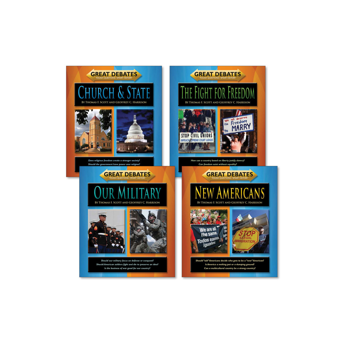 Great Debates is as an information-packed series that stimulates smart discussion with tough questions. Each book in the series aligns with Common Core Language Arts Anchor Standards for Reading Informational Text and Speaking and Listening and contains critical thinking components in regards to social issues and history. Great Debates takes its name from the spirited discourse that surrounds each historical theme in the series. The narrative pauses at defining moments and "drops in" on influential Americans battling over two sides of a key issue. Readers learn how arguments are framed, and make eye-opening connections between great debates from the past and the ones that are taking place today. Text strengthens critical thinking skills with open-ended questions concerning social issues and history. Readers are invited to "find their own voice" and get involved if they find they have an interest in the issue. Set of 4 paperback books.