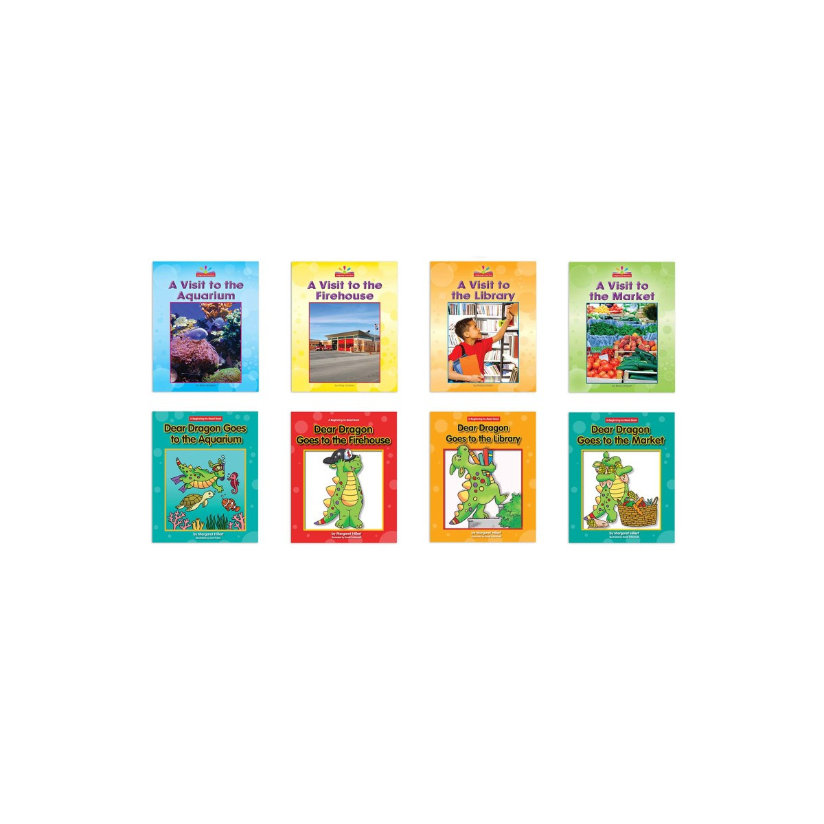 Books in the Community Places set include: A Visit to the Aquarium, Dear Dragon Goes to the Aquarium, A Visit to the Firehouse, Dear Dragon Goes to the Firehouse, A Visit to the Library, Dear Dragon Goes to the Library, A Visit to the Market, and Dear Dragon Goes to the Market.