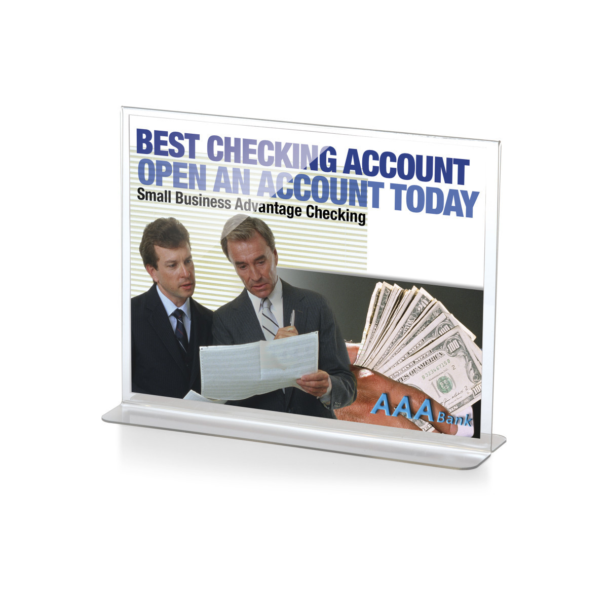 Displays your signs upright on desk or flat surface. For signs 11" W x 8 1/2" H. Self-Standing. Literature slides in from bottom. Made from clear plastic.