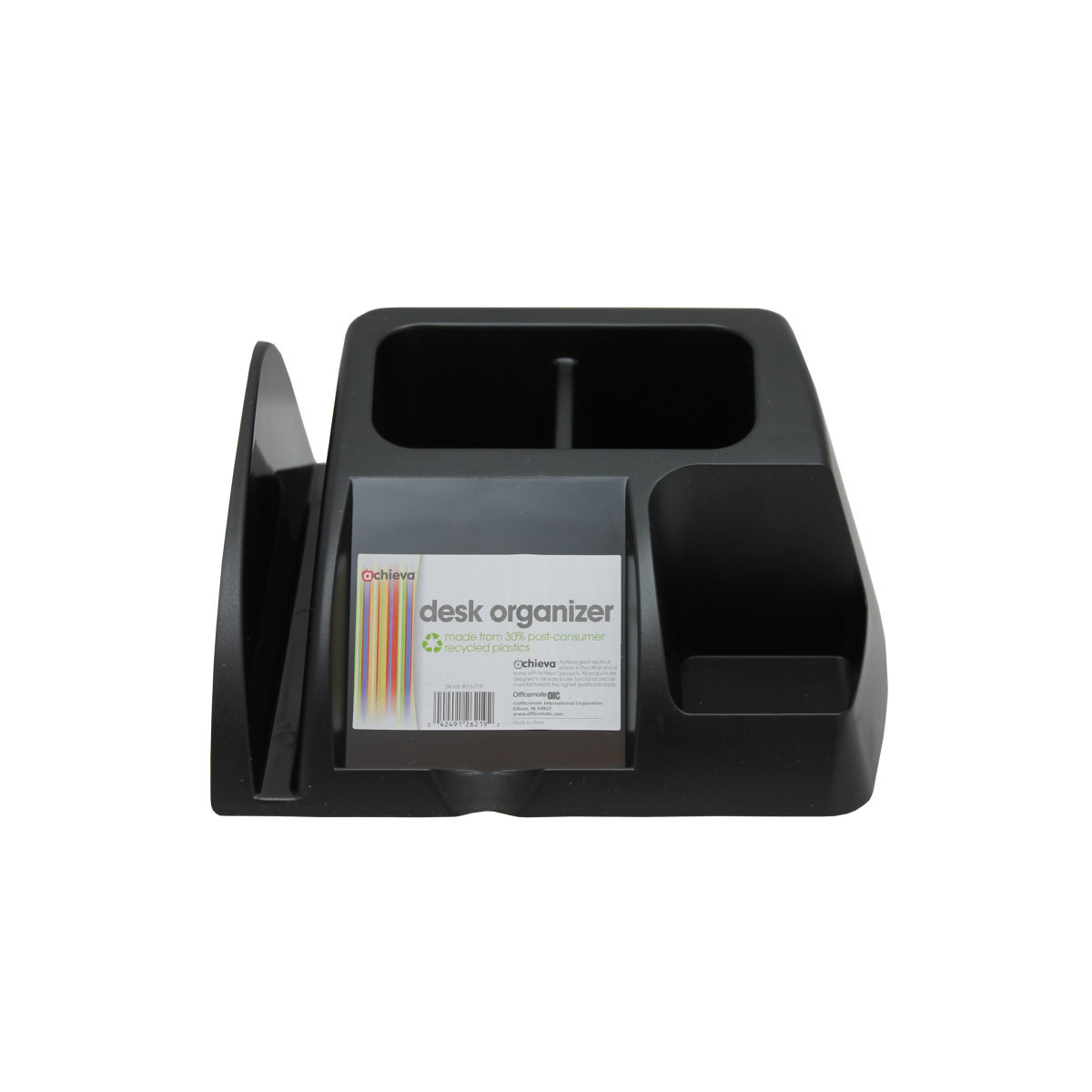 Separate compartments for all your daily needs. Stylish and innovative designs. Clean lines and compact footprint make this an efficient means to organize your workspace. 5 separate storage areas: 2 for pens/pencils, 1 for clips, 1 for sticky notes, and 1 for extra paper, notes, or envelopes. Made from 30 percent post-consumer recycled plastic.