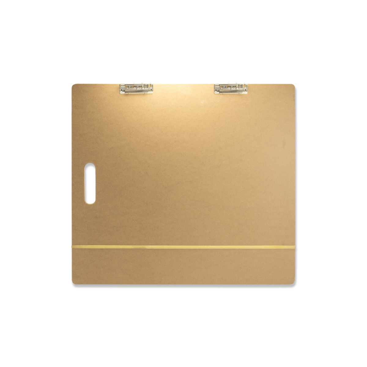 Designed to use in the studio, classroom, field, or home. Dual heavy-duty latch clips to hold paper or sketch pad in place while drawing. Convenient cut-out handle for easy carrying. Oversized rubber band securely holds artworks or documents in place. Durable, high-quality hardboard creates a smooth drawing surface. Made from tempered hardboard. Measures 23" x 26".