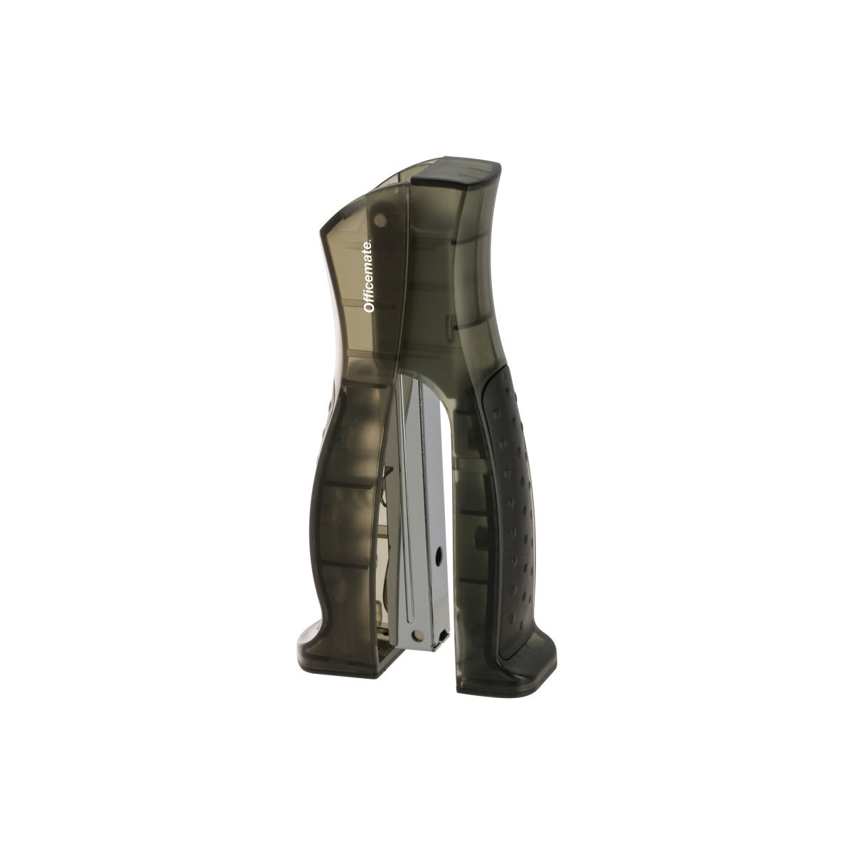 Full-Strip Plastic Transparent Black Stand-Up Stapler. Able to stand up or lay flat on desktop. Can be opened up and used to tack on notices on cork bulletin board. Ergonomic design makes stapling a breeze. Staples 20 sheets of 20 lb paper.