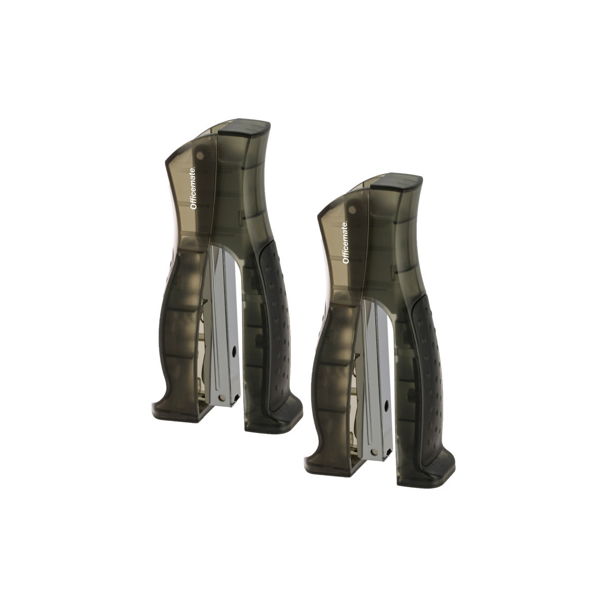 Full-Strip Plastic Transparent Black Stand-Up Stapler. This stapler is able to stand up or lay flat on desktop. Can be opened up and used to tack on notices on cork bulletin board and has an ergonomic design makes stapling a breeze. Staples 20 sheets of 20 lb paper. Sold as a pack of 2 staplers.