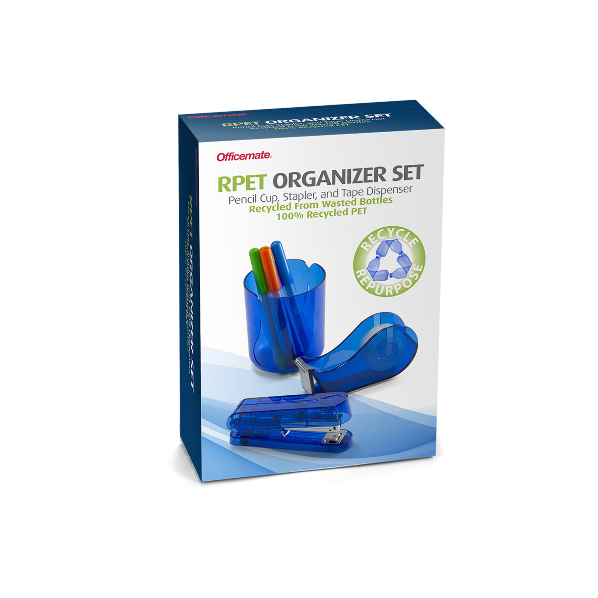 - This Officemate® 3-Piece Eco-Friendly Desk Organizer Set is made from recycled bottles (100% post-consumer recycled plastic)