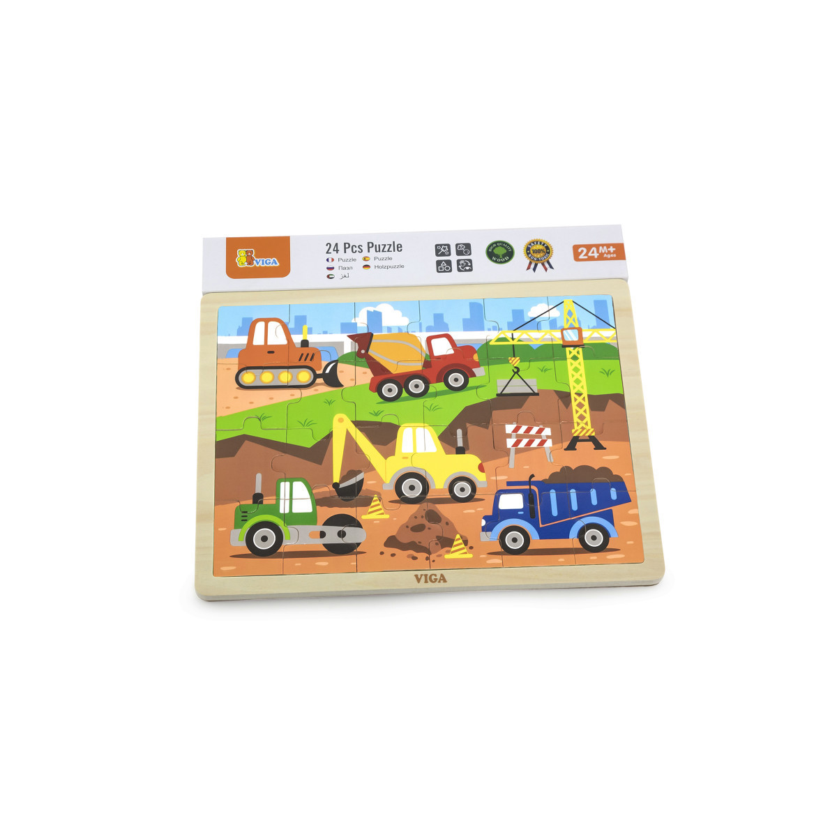 - 24-piece puzzle featuring vibrant construction vehicles.