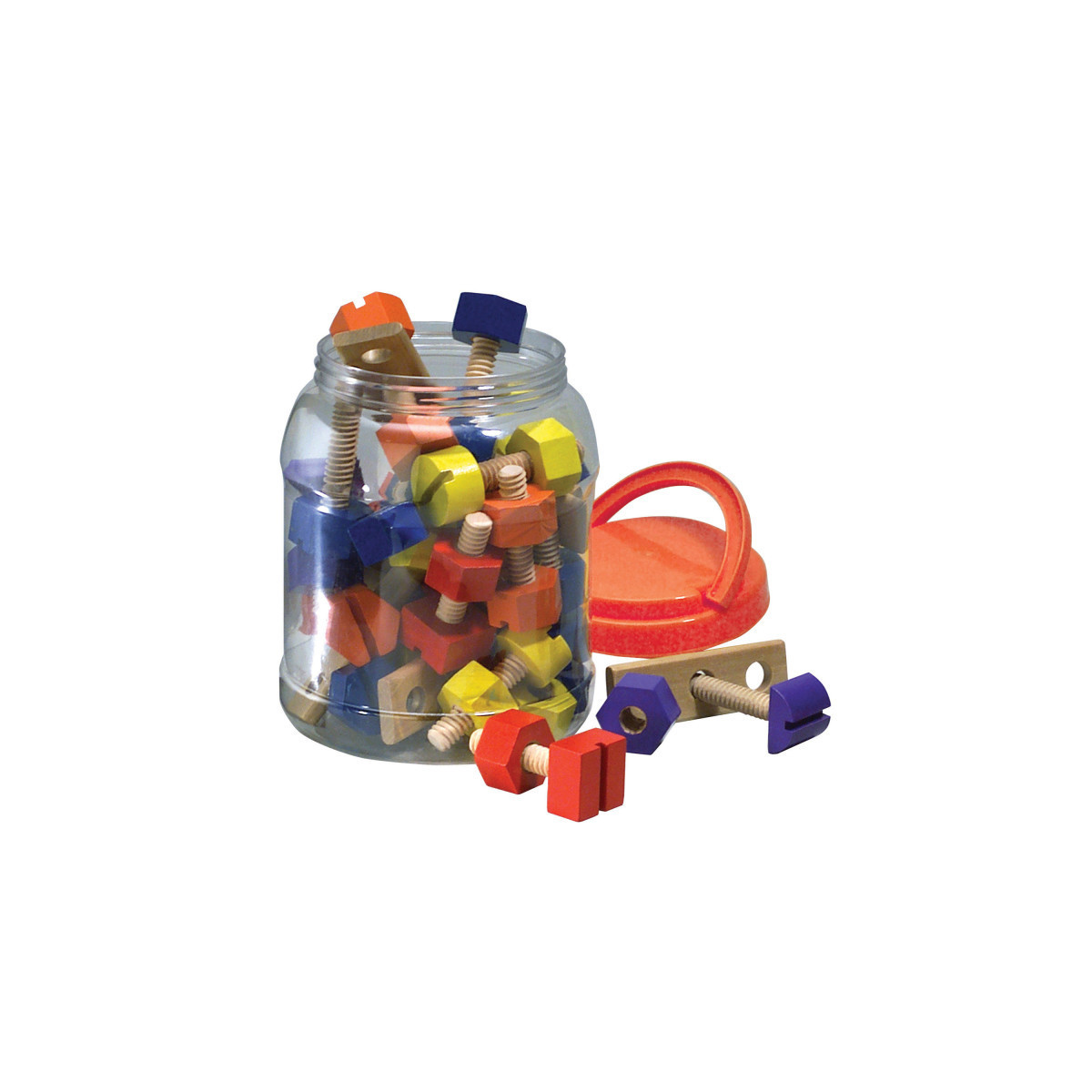 Nuts & Bolts comes with 40 pieces, packed in a carry along bucket. This item is constructed of hardwood (beechwood) and will provide skills for matching of gears, construction building and hours of multiple tasking. For ages 3 and up.