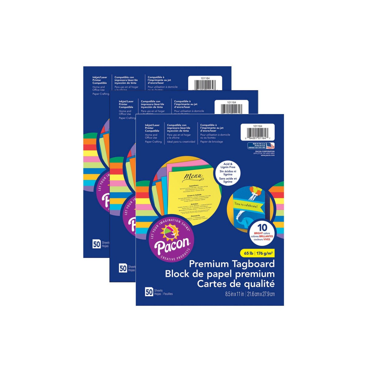Strong 65 lb. paper great for art projects, crafts, card and recipe making and more. Inkjet and laser printer compatible. Ten bright colors per package. Colors include: Violet, Pumpkin, Hyper Yellow, Rojo Red, Hyper Lime, Hyper Pink, Cobalt Blue, Marine Blue, Emerald Green and Gold. Acid-free and recyclable. Each pack includes 50 sheets. Each sheet measures 8.5" x 11". Sold as 3 packs for a total of 150 sheets.