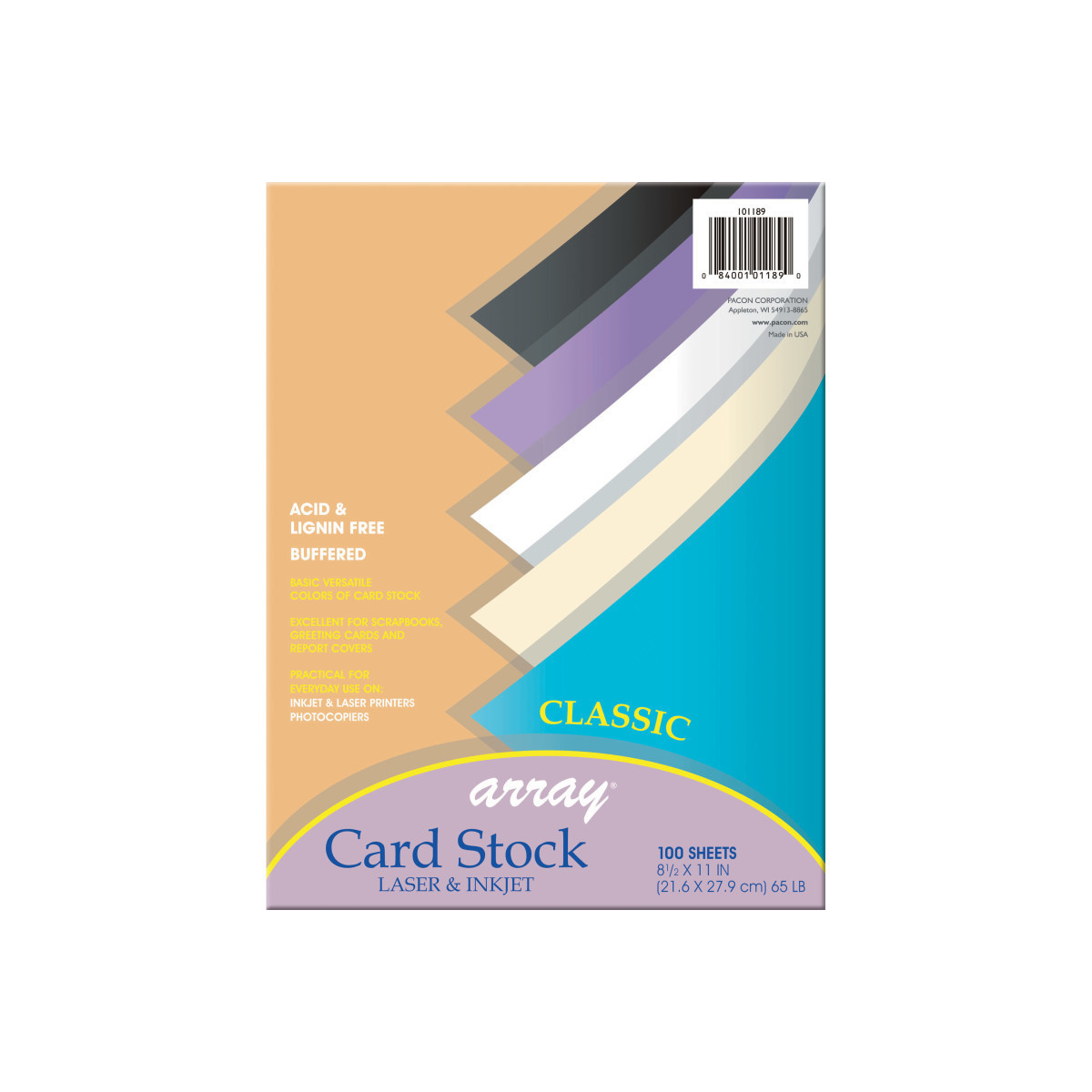 Heavyweight, 65 lb. acid-free paper is perfect for greeting cards, postcard, report covers, rubber stamping, memory books, flyers, announcements and more. Lignin free and buffered. Acid-free and recyclable. Assortment includes: Ivory, Black, White, Violet and Cobalt Blue. Each pack includes 100 sheets. Each sheet measures 8.5" x 11".