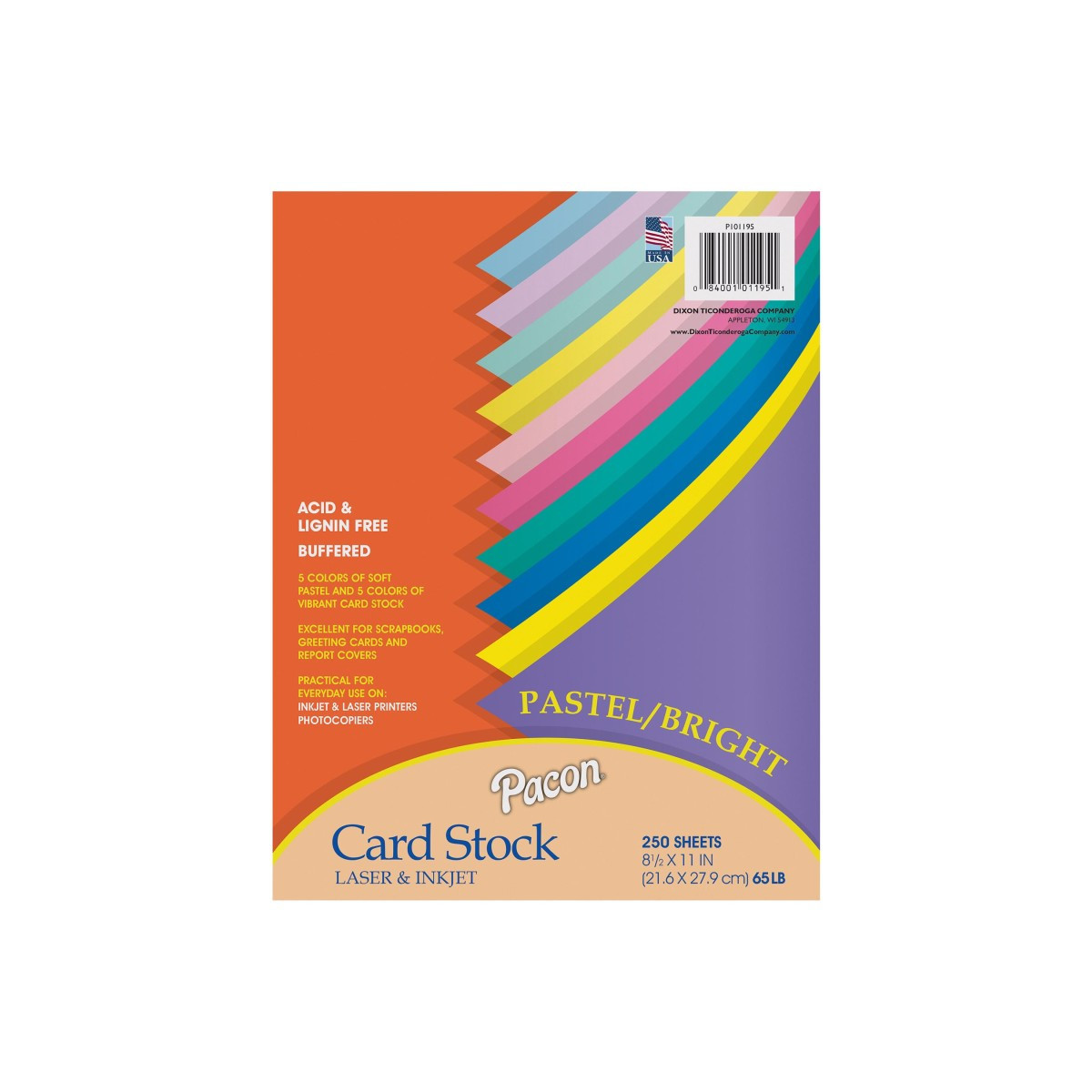 Heavyweight 65 lb. acid-free card stock is perfect for greeting cards, postcards, report covers, rubber stamping, memory books, flyers, announcements and more. Sheets are lignin free, buffered and laser and inkjet printer compatible. Sold in film-wrapped packages. Recyclable. Assorted 10 Pastel/Bright colors include: Pink, Blue, Canary, Green, Lilac, Hot Pink, Marine Blue, Lemon Yellow, Turquoise and Violet. Measures 8-1/2" x 11". Each pack includes 250 sheets.