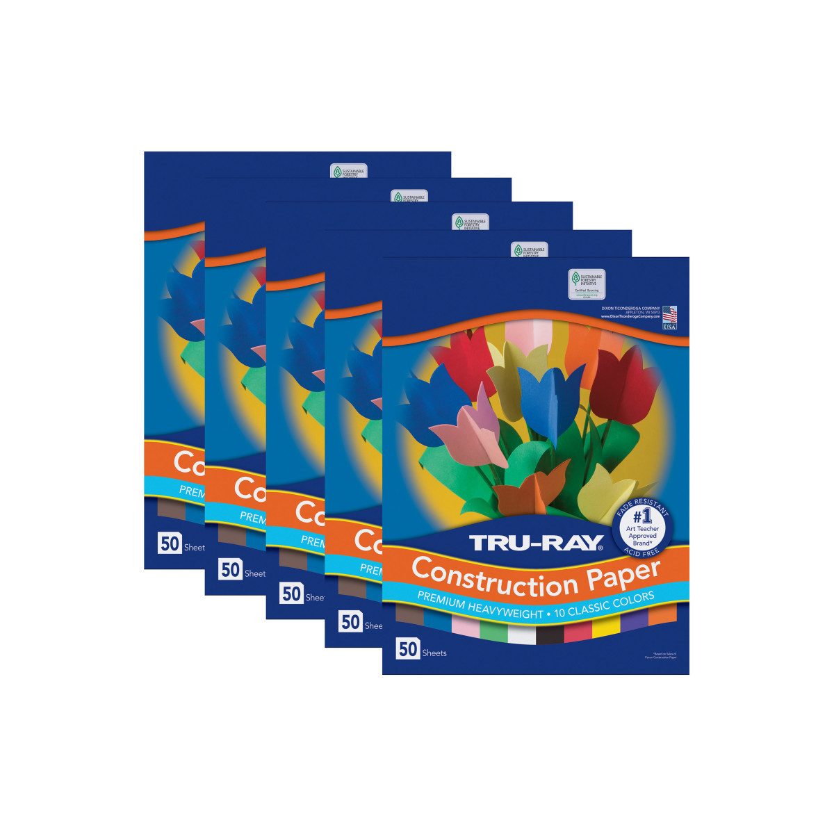 Heavyweight 100% vat-dyed sulphite with longer, stronger fibers. Tru-Ray® Construction Paper is tough enough to take scoring, folding and curling without cracking and tearing. Its superior fade-resistance keeps projects brighter and fresher longer. Colors include: White, Black, Orange, Yellow, Festive Green, Pink, Purple, Blue, Dark Brown, and Red. Acid free for less fade. 50% recycled fiber content and recyclable. Measures 9" x 12". Each pack includes 50 sheets. Sold as 5 packs for a total of 250 sheets.