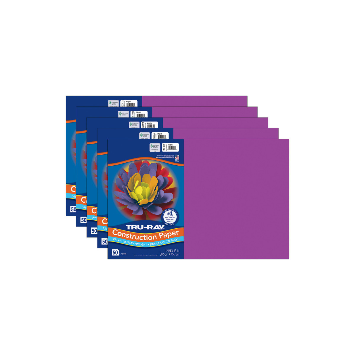 Heavyweight 100% vat-dyed sulphite with longer, stronger fibers. Tru-Ray® Construction Paper is tough enough to take scoring, folding and curling without cracking and tearing. Its superior fade-resistance keeps projects brighter and fresher longer. Available in 28 stay bright colors. Acid free for less fade. 50% recycled fiber content and recyclable. Measures 12" x 18". Each pack includes 50 sheets. Sold as 5 packs for a total of 250 sheets.