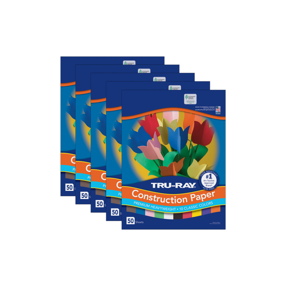 Heavyweight 100% vat-dyed sulphite with longer, stronger fibers. Tru-Ray® Construction Paper is tough enough to take scoring, folding and curling without cracking and tearing. Its superior fade-resistance keeps projects brighter and fresher longer. Colors include: White, Black, Orange, Yellow, Festive Green, Pink, Purple, Blue, Dark Brown, and Red. Acid free for less fade. 50% recycled fiber content and recyclable. Measures 12" x 18". Each pack includes 50 sheets. Sold as 5 packs for a total of 250 sheets.