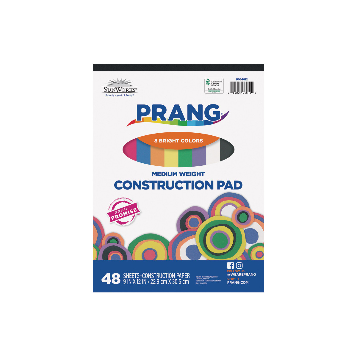 Prang® Medium Weight Groundwood Construction Paper Pad features 8 assorted colors: Scarlet, Orange, Blue, Violet, Green, Yellow, Black, and White. It is perfect for beginner arts & crafts. Great for both home and school use and is portable. Recyclable. Measures 9" x 12". Each pad includes 48 sheets.